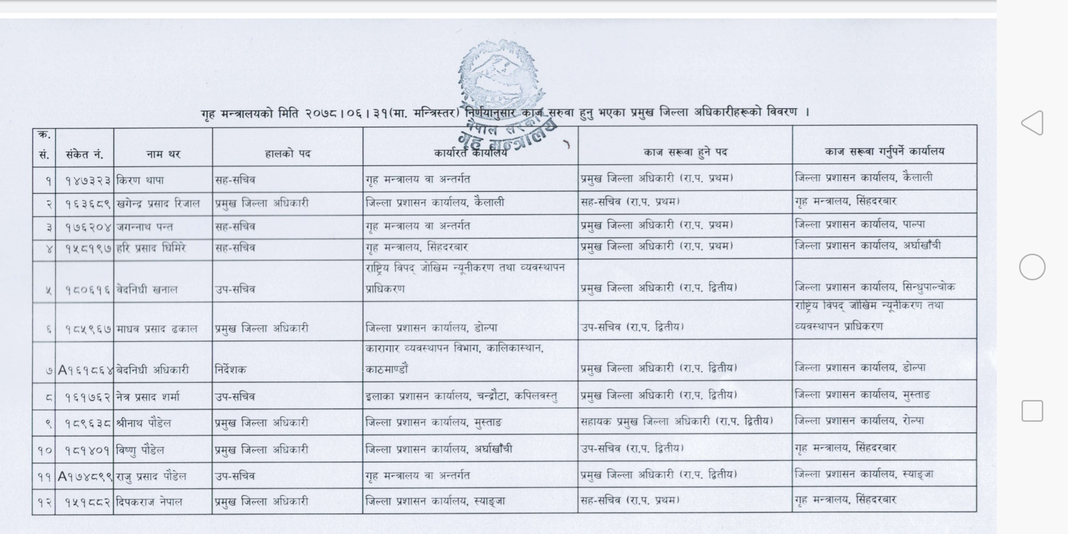 गृह मन्त्रालयले किरण थापालाई कैलालीको प्रमुख जिल्ला अधिकारी बनाएको छ। त्यस्तै गृहले पाल्पामा जगन्नाथ पन्त, अर्घाखाँचीमा हरि प्रसाद घिमिरे, सिन्धुपाल्चोकमा बेदनिधी खनाललाई प्रमुख जिल्ला अधिकारीकाे जिम्मेवारी दिएको छ। गृहले डोल्पामा बेदनिधी अधिकारी, मुस्ताङमा नेत्र प्रसाद शर्मा, लमजुङमा श्रीनाथ पौडेल र स्याङजामा दिपकराज नेपाललाई प्रमुख जिल्ला अधिकारीकाे जिम्मेवारी दिएको हाे।