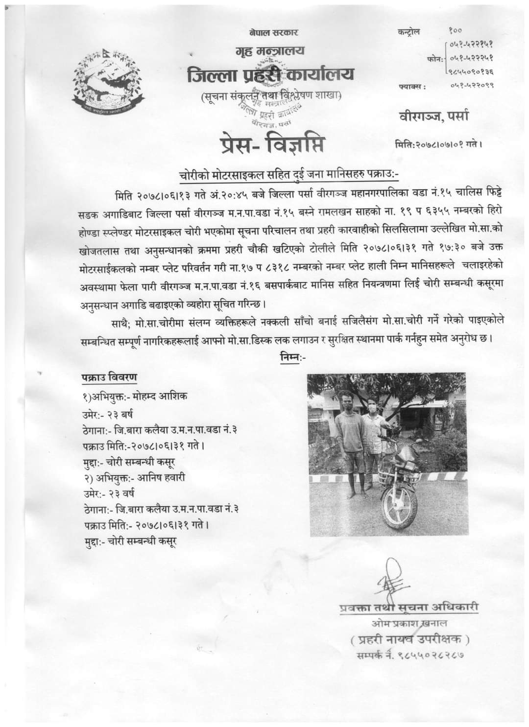 ०७८।०६।१३ गते अं.२०:४५ बजे जिल्ला पर्सा वीरगञ्ज महानगरपालिका वडा नं.१५ चालिस फिट्टे सडक अगाडिबाट जिल्ला पर्सा वीरगञ्ज म.न.पा.वडा नं.१५ का रामलखन साहको ना. १९ प ६३५५ नम्बरको हिरो होण्डा स्प्लेण्डर मोटरसाइकल चोरी भएको थियो ।