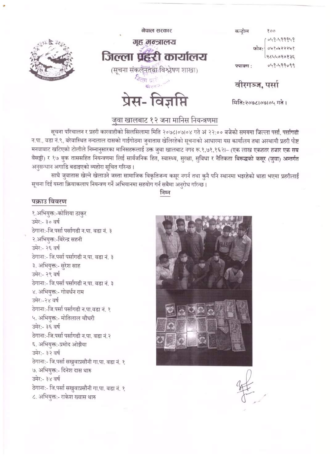जिल्ला प्रहरी कार्यालय पर्सा र अस्थायी प्रहरी पोष्ट मनवाबाट खटिएको टोलीले पर्सागढी नगरपालिका वडा नं. ३ निवासी ३० बर्षिय कोशिया ठाकुर, २६ बिर्षिय बिरेन्द्र सहनी, २९ बर्षिय सुरेश साह, वडा नं. १ निवासी २४ बिर्षिय गोवर्धन राम, ३२ बर्षिय प्रमाेद ओझैया, वडा नं. २ निवासी ३६ बर्षिय माेतिलाल चाैधरी, सखुवा प्रसौनी गाउँपालिका वडा नं. १ निवासी ३४ बर्षिय दिनेश दास थारु, ३६ बर्षिय राकेश ख्वास थारु, पटेर्वा सुगाैली गाउँपालिका वडा नं. १ निवासी ३५ बर्षिय ज्वाला गिरी, बाराकाे जितपुर सिमरा उपमहानगरपालिका वडा नं. ७ निवासी ३० बर्षिय नन्दु मुखिया, २२ बर्षिय प्रमाेद राउत, सिम्रोनगढ नगरपालिका वडा नं. १ निवासी २५ बर्षिय अनिल जयसवाललाई पक्राउ गरेकाे हाे ।