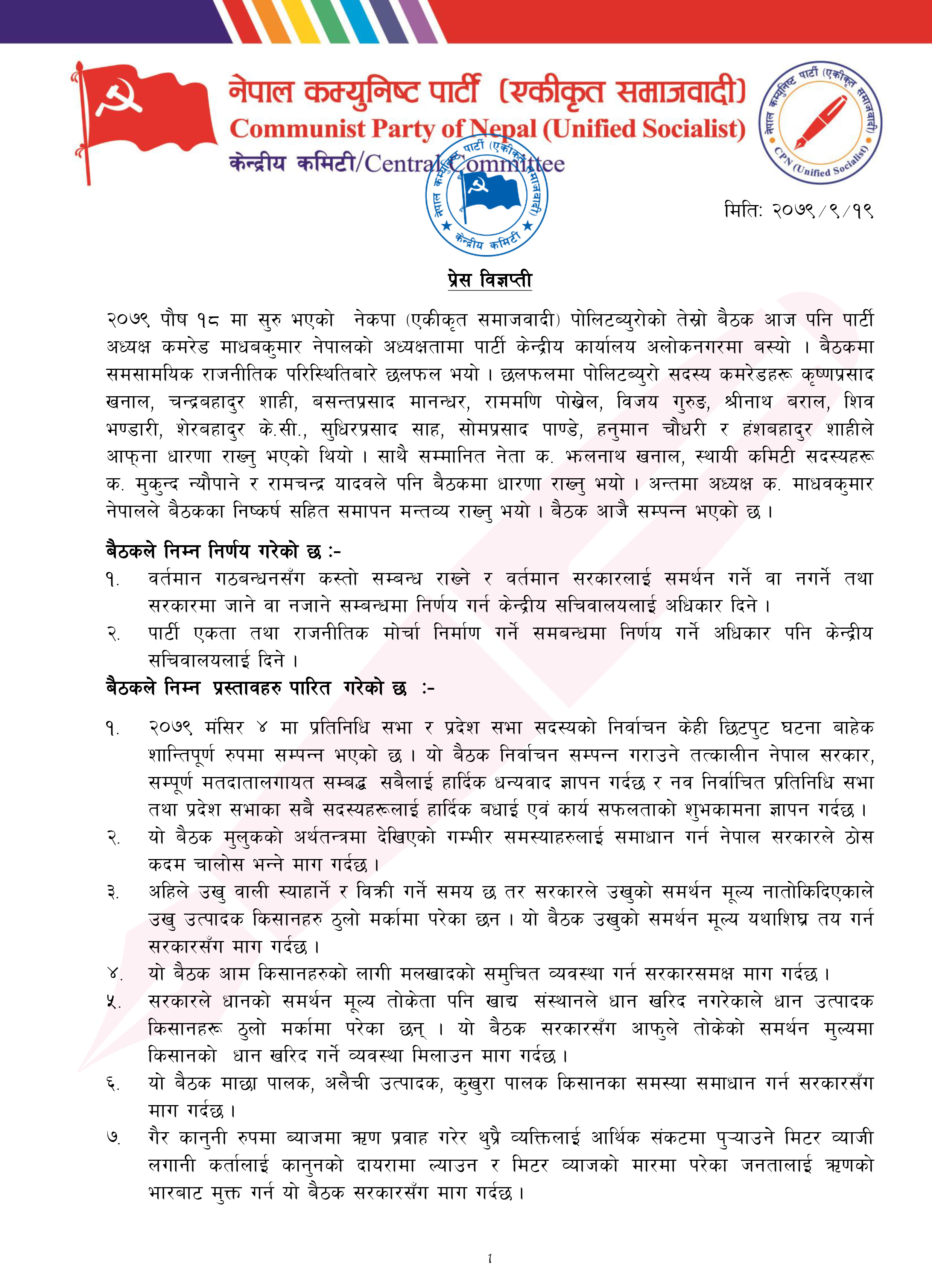 पहिलो निर्णय, हाम्रो पार्टी सदैव वामपन्थीको बीचमा एकता गर्ने, सहकार्य गर्ने, मोर्चा बनाउने र वामपन्थी जनमतहरुलाई एक ठाउँमा ल्याउने कुरामा केन्द्र भागमा रहेर काम गर्ने कुरामा सधैंभरी प्रतिवद्ध छ। विगतमा पनि थियो, आज पनि छ र भोलि पनि यो जिम्मेवारीलाई हाम्रो पार्टीले पूरा गर्नेछ। त्यसकारण यसका लागि हाम्रो केन्द्रिय पोलिटव्यूरो बैठकले हाम्रो केन्द्रिय सचिवालयलाई यस सम्बन्धि गृहकार्य गर्नका निम्ति अनुमति प्रदान गरेको छ। अब यो काम केन्द्रिय सचिवालयले संयोजन गर्दै अगाडि बढाउनेछ’, पार्टीको निर्णयबारे उनले भने।