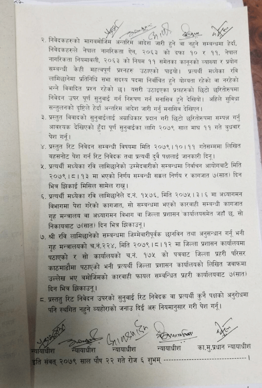 लामिछानेको उम्मेदवारीको सम्बन्धमा निर्वाचन आयोगले मंसिर १३ मा गरेको निर्णयको सक्कल फाइल पनि सात दिनभित्र झिकाएर मिसिलमा सामेल गर्न संवैधानिक इजलासले भनेको छ।