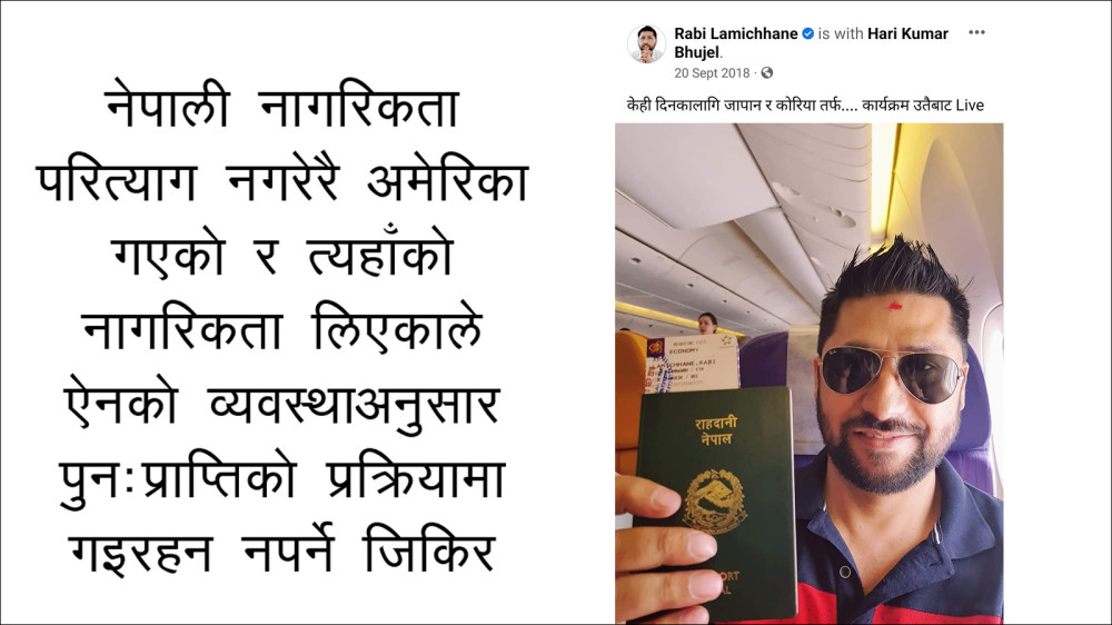 नेपालअखबार, काठमाडौँ । उपप्रधान तथा गृहमन्त्रीको जिम्मेवारी सम्हालिरहेका राष्ट्रिय स्वतन्त्र पार्टीका सभापति रवि लामिछानेले अमेरिकी नागरिकका हैसियतमा नेपाली भिसामा आएका बेला पुरानो नागरिकता पेस गरेर पासपोर्ट लिएको स्वीकार गरेका छन् ।