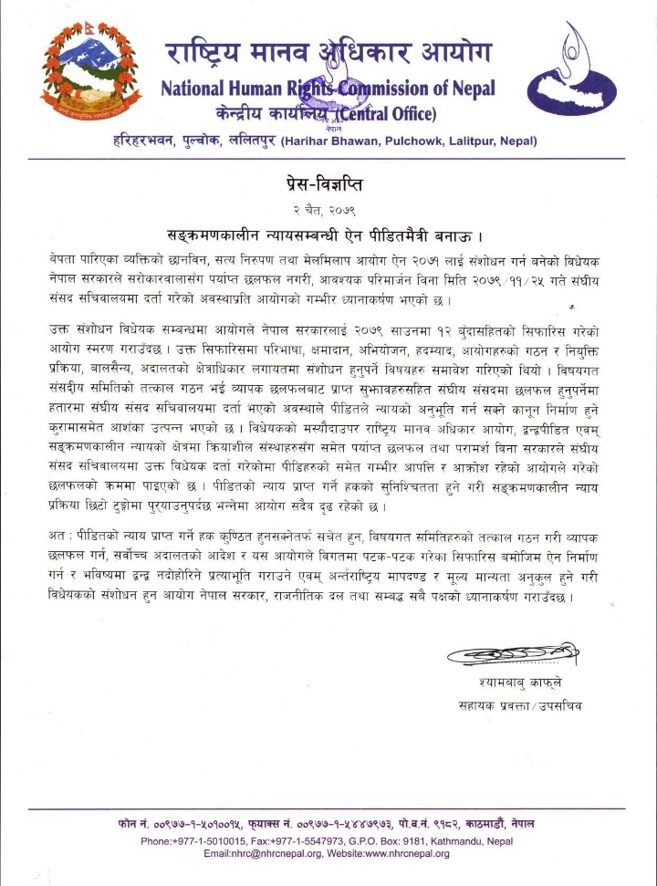 आयोगका सहायक प्रवक्ता श्यामबाबु काफ्लेले बिहीबार प्रेस विज्ञप्ति जारी गरी बेपत्ता पारिएका व्यक्तिको छानबिन, सत्य निरूपण तथा मेलमिलाप आयोग ऐन, २०७१ लाई संशोधन गर्न बनेको विधेयक सरकारले संघीय संसद् सचिवालयमा दर्ता गरेको अवस्थाप्रति गम्भीर ध्यानाकर्षण भएको जनाएको छ। आयोगले यसअघि गरेको १२ बुँदे सिफारिशको स्मरण गराएको छ।