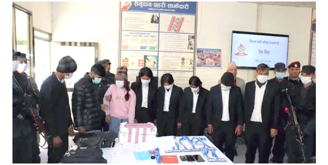 काठमाडौं । नेपाल प्रहरीले आन्तरिक राजस्व कार्यालयका नक्कली कर्मचारी बनेर ठगी गर्ने आठ जनालाई पक्राउ गरेको छ । जिल्ला प्रहरी परिसर काठमाडौँको टोलीले आन्तरिक राजस्व कार्यालयका नक्कली कर्मचारी बनेर ठगी तथा किर्ते गर्ने उनीहरूलाई पक्राउ गरी सार्वजनिक गरेको हो ।