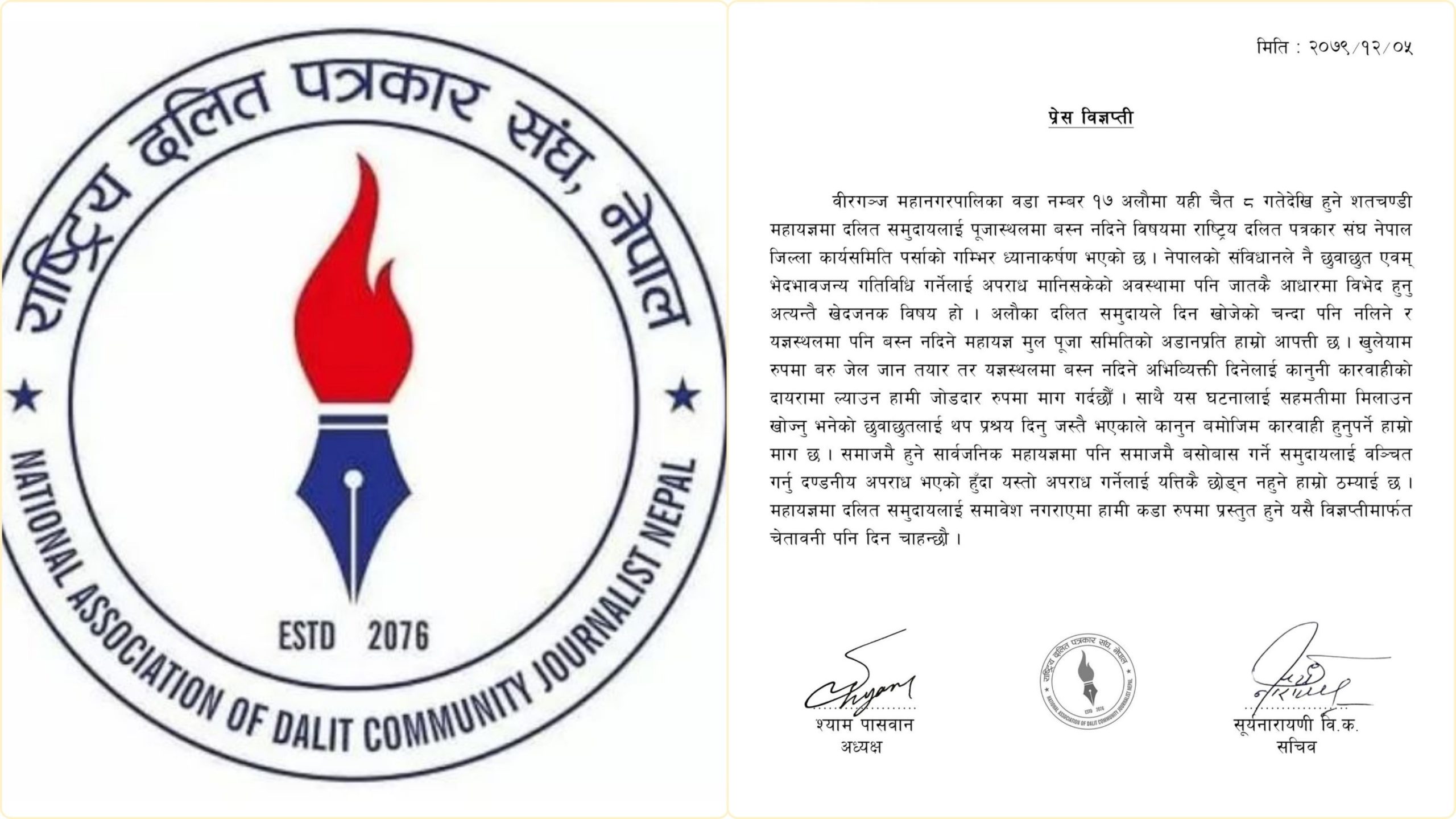 संविधानले नै छुवाछुत एवम् भेदभावजन्य गतिविधिलाई अपराध मानेको अवस्थामा पनि जातकै आधारमा विभेद हुनु खेदजनक भएको संघका अध्यक्ष श्याम पासवान र सचिव सूर्यनारायण वि.क.द्वारा सयुँक्त रुपमा जारी विज्ञप्तमा भनिएको छ ।