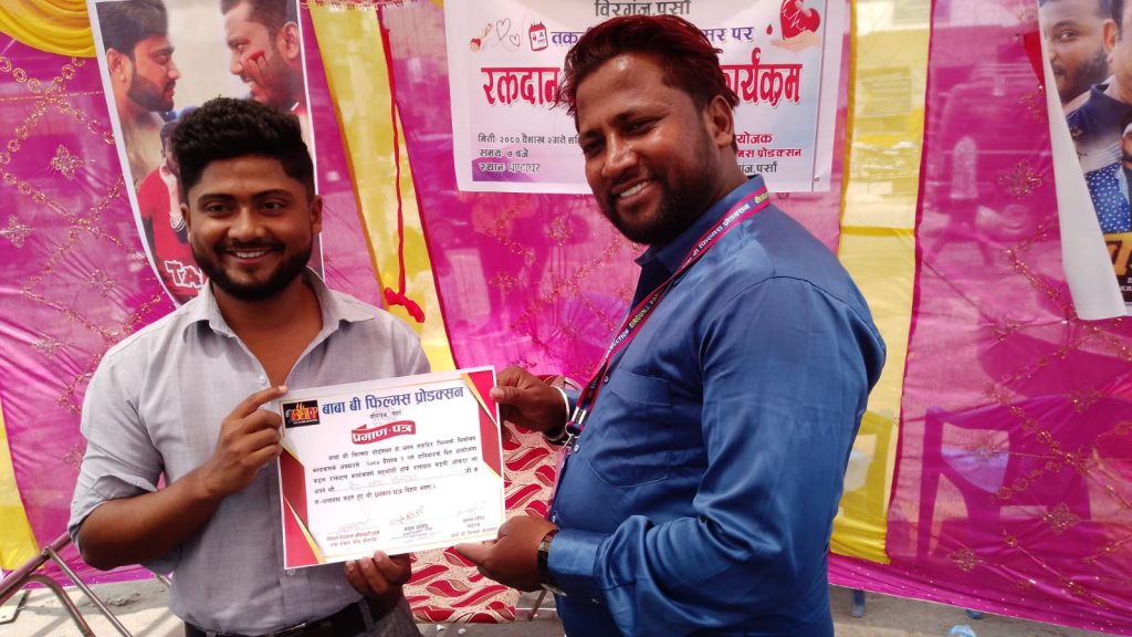 पर्सा । बीरगंज घण्टाघरमा बाबा बी फिल्मस द्वारा रक्तदान तथा बिमोचन कार्यक्रम सम्पन्न भएको छ । बाबा बी फिल्मस प्रोडक्सन बीरगंज पर्सा द्वारा आयोजित रक्तदान कार्यक्रममा एकजना महिला सहित छतिस जनाले रक्तदान गरेका छन् ।
