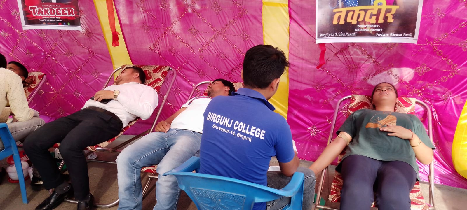बाबा बी फिल्मस प्रोडक्सन बीरगंज पर्साका कैमरामैन तथा डाईरेक्टर कृष्णा पंडीतको अध्यक्षतामा भएको रक्तदान तथा तकदीर मुभीको बिमोचन कार्यक्रमका बिशिष्ट अतिथीमा सामाजिक अभियन्ता बृजेश्वर चौधरी,प्रकाश थारु,रामकिशोर मिश्रा,कलाकार सुनील पंडित, शिव पटेल,ज्ञानेन्द्र कुमार सिंह,अराध्या श्रीवास्तव,कृष्णा हमराही,भुवन पंडित,भागीरथ साह,संगीता तिवारी,पुनम चौधरी,सुस्मिता यादव लगायतको उपस्थिति रहेको थियो।