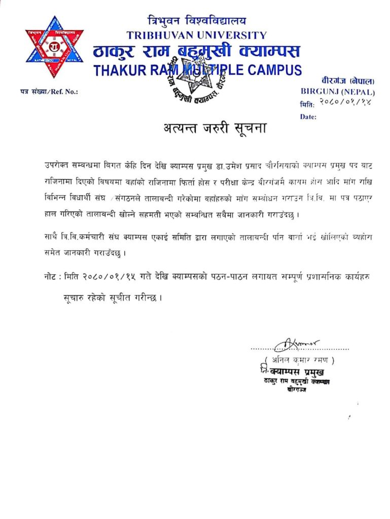 निमित्त क्याम्पस प्रमुख अनिल कुमार रमणले बिहिवार एक सूचना जारी गर्दै तालाबन्दी खोल्ने र पठनपाठन सुचारी गर्ने सहमती भएको जानकारी दिएका छन् ।