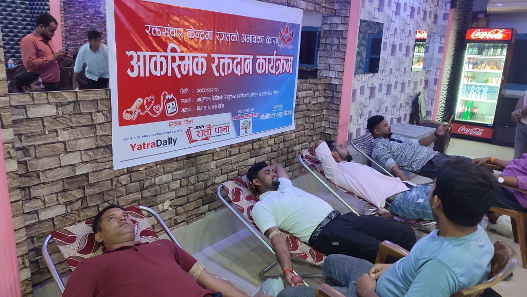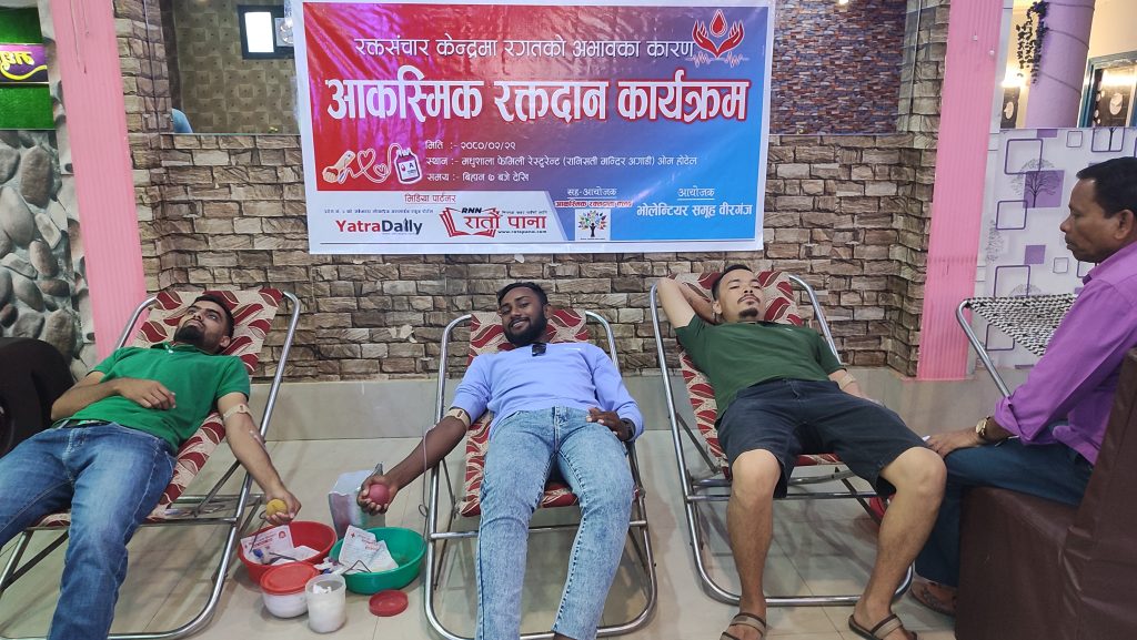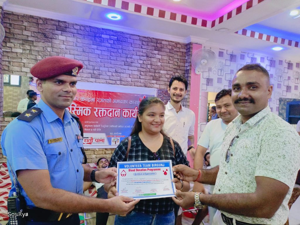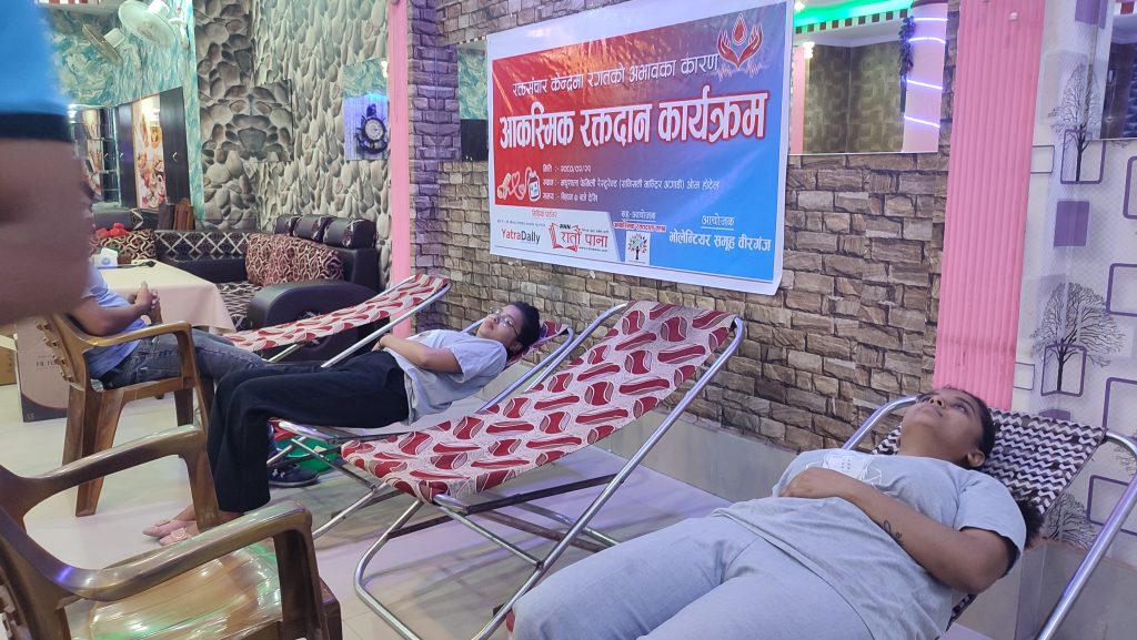 वीरगन्ज । आज आयोजित आकस्मिक रक्तदान कार्यक्रममा ६ महिला सहित ३० जनाले रगत दान गरेका छन् । रक्तसञ्चार केन्द्र वीरगन्जमा रगतको अभाव रहेको जानकारी पाएपछि भोलेन्टियर समूह वीरगन्जले आकस्मिक रक्तदान कार्यक्रमको आयोजना गरेको थियो ।