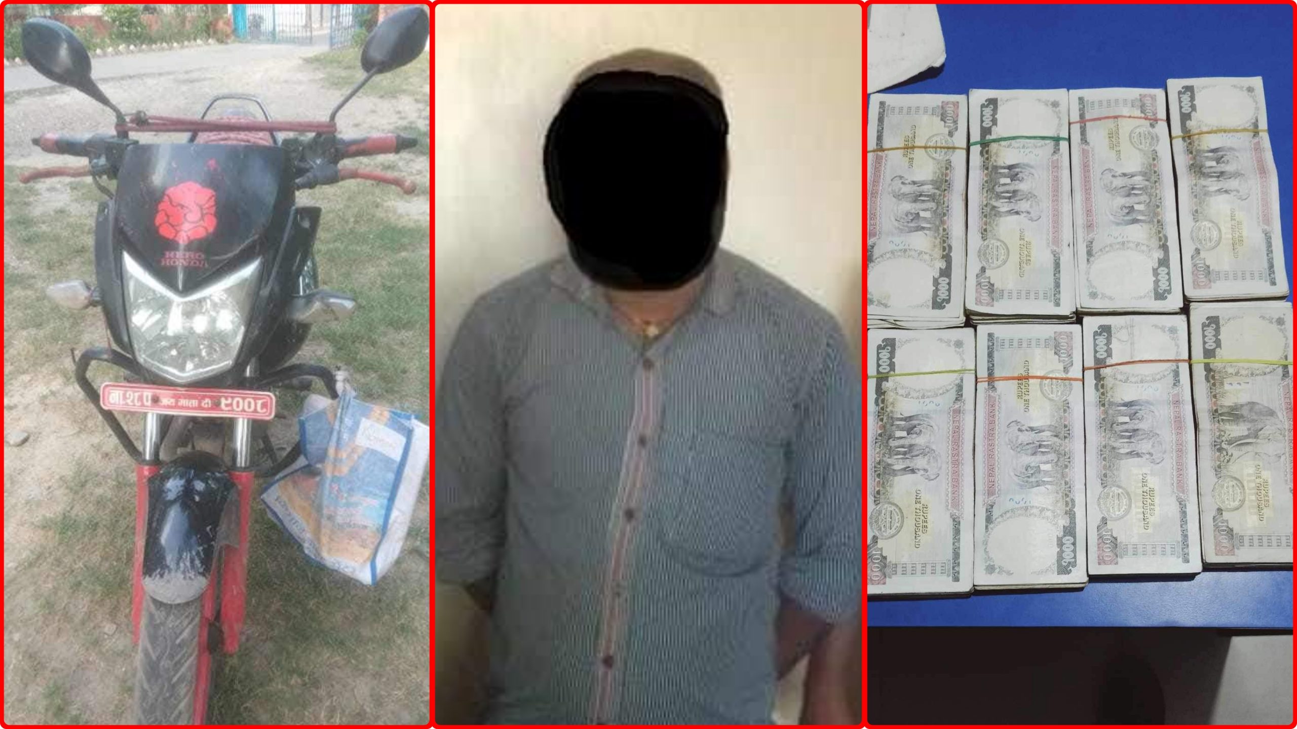 सीमावर्ती शहर रक्सौलबाट वीरगञ्ज तर्फ मोटरसाइकलमा ८ लाख नगद रकम लिएर प्रवेश गरेको अवस्थामा इनर्वा प्रहरी चौकीबाट खटिएको प्रहरी टोलीले एक जनालाई पक्राउ गरी सार्वजनिक गरेको हो ।