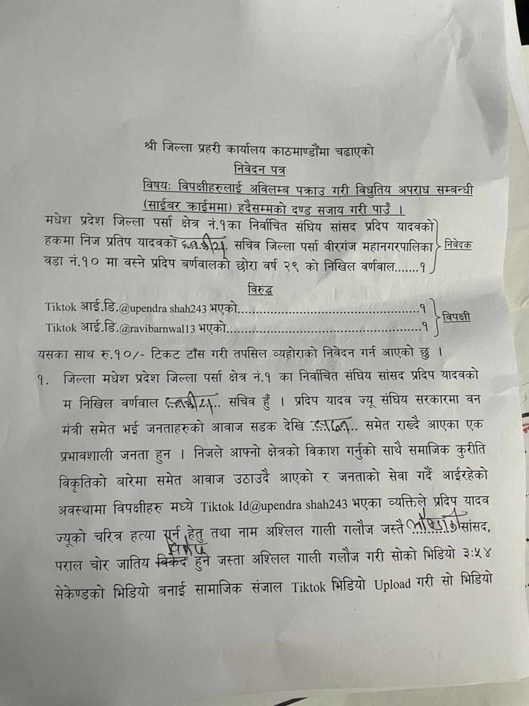 सांसद यादवका स्वकीय सचिव निखिल वर्णवाले जिल्ला प्रहरी कार्यालयमा उजुरी हाल्दै Tiktok Id@upendra shah243 भएका व्यक्तिले गाली गलौच गरेको चरित्र हत्या गरेको दाबी गरेका छन् । मधेस प्रदेश जिल्ला पर्सा क्षेत्र नम्बर १ का निर्वाचित सांसद प्रदीप यादव वन मन्त्री समेत भइसकेको र जनताको आवाज सडकदेखि सदनसम्म राख्दै आएको उल्लेख गर्दै सांसद यादवलाई अश्लील गाली गलौच गरेकाले हदैसम्मको कारबाहीको माग गरिएको छ ।