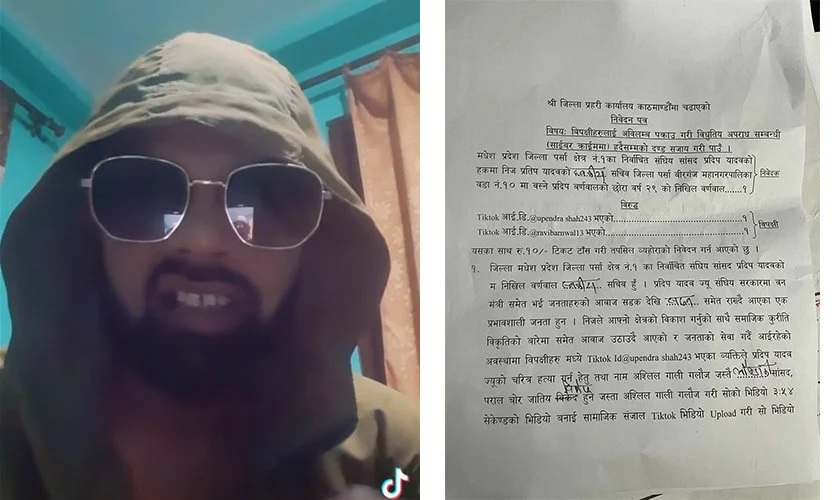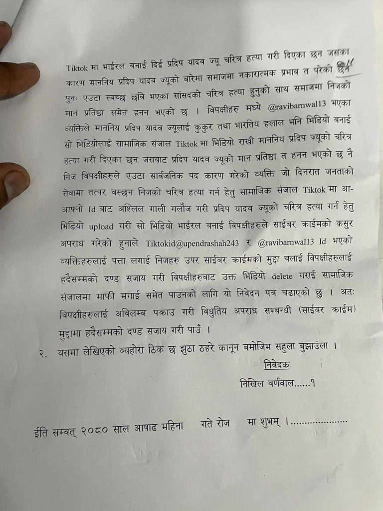 अश्लील गाली गलौच गरी ३ः५४ सेकेन्डको भिडियो बनाई सामाजिक सञ्जालमा राखिएको छ । त्यसले गर्दा सांसद यादवको चरित्र हत्या हुनुको साथ समाजमा उनको मान प्रतिष्ठा समेत हनन भएको दाबी उजुरीमा गरिएको छ । Tiktokid@upendrashah243 @ravibarnwal13 Id भएको व्यक्तिलाई पक्राउ गरी भिडियो डिलिट गराई कानुनी कारबाही गर्न माग गरिएको छ । साभार