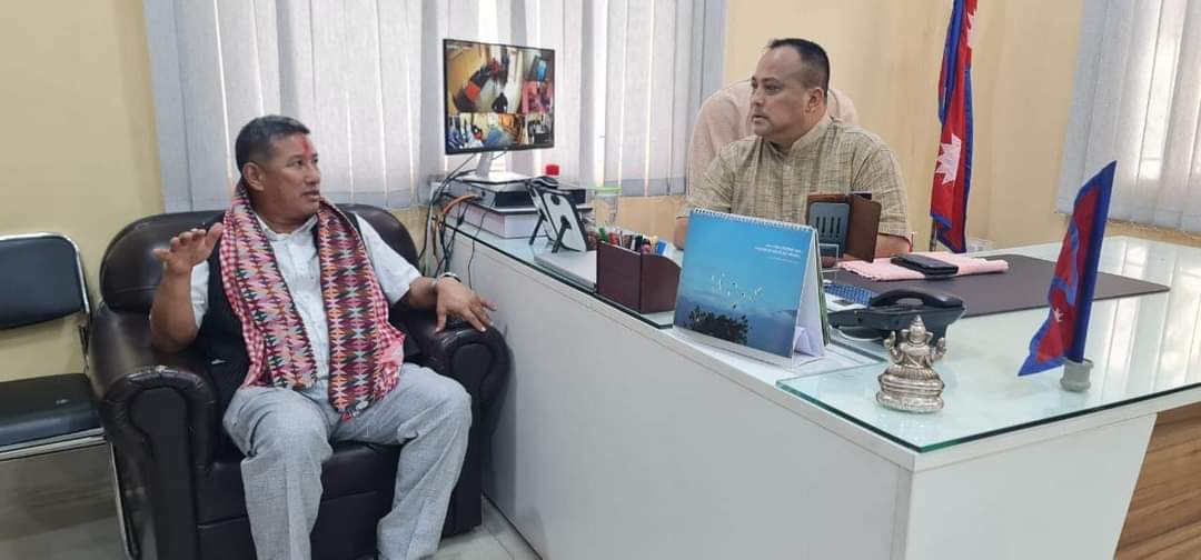 मेयर सिंहले शनिबार आफ्नै कार्यकक्षमा नेपाल सरकारका युवा तथा खेलकुद मन्त्री डिगबहादुर लिम्बुलाई स्वागत गर्दै रंगशाला पुनःनिर्माण गर्न अतिआवश्यक रहेकाले बजेटको व्यवस्था मिलाइदिन आग्रह गर्नुभयो ।