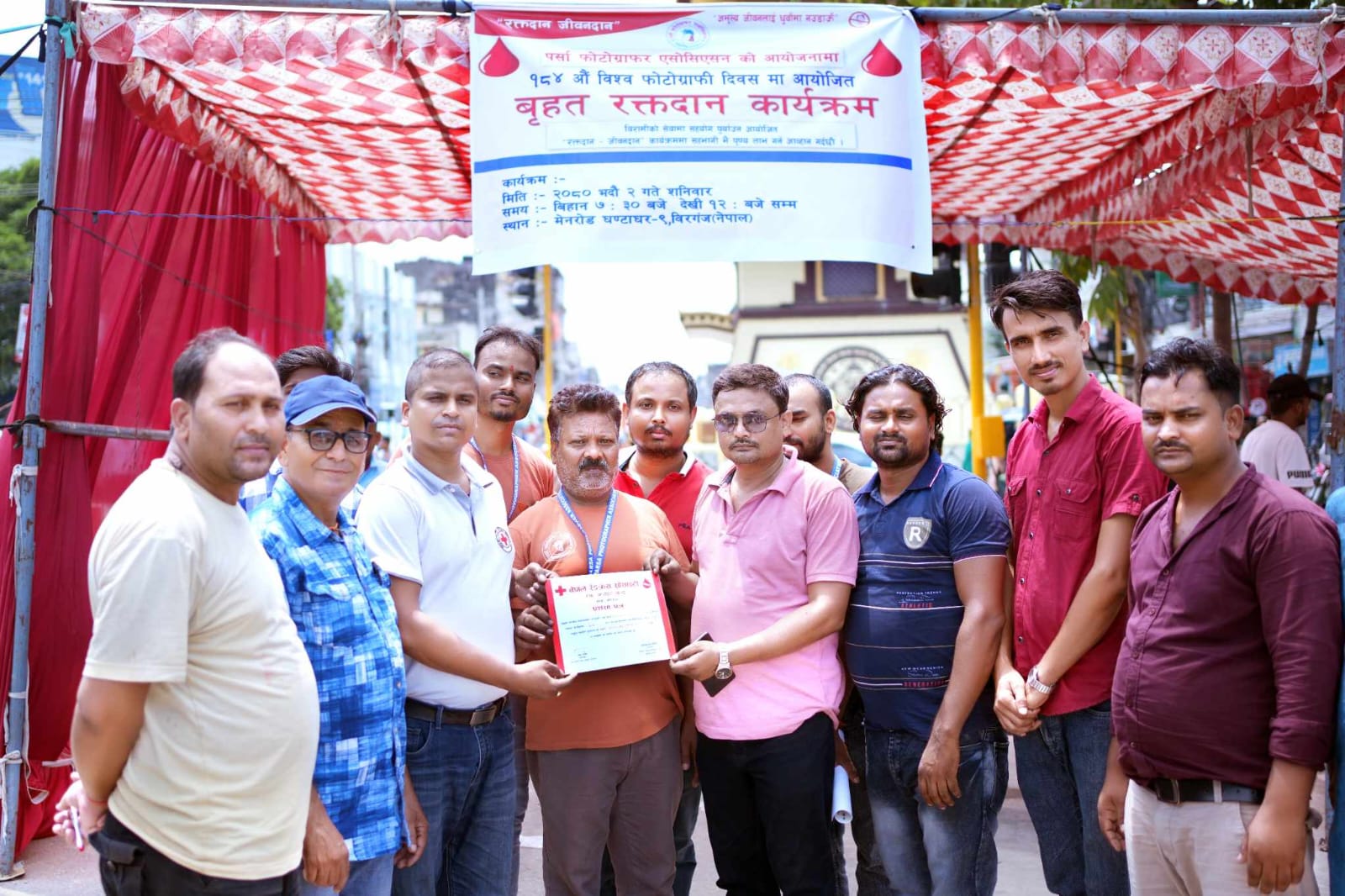 बीरगंज । १८४ वौ विश्व फोटोग्राफी दिवसको अवसर पारेर पर्सा फ़ोटोग्राफर एसोशिएशन द्वारा घण्टाघर चौकमा रक्तदान कार्यक्रम सम्पन गरिएको छ।