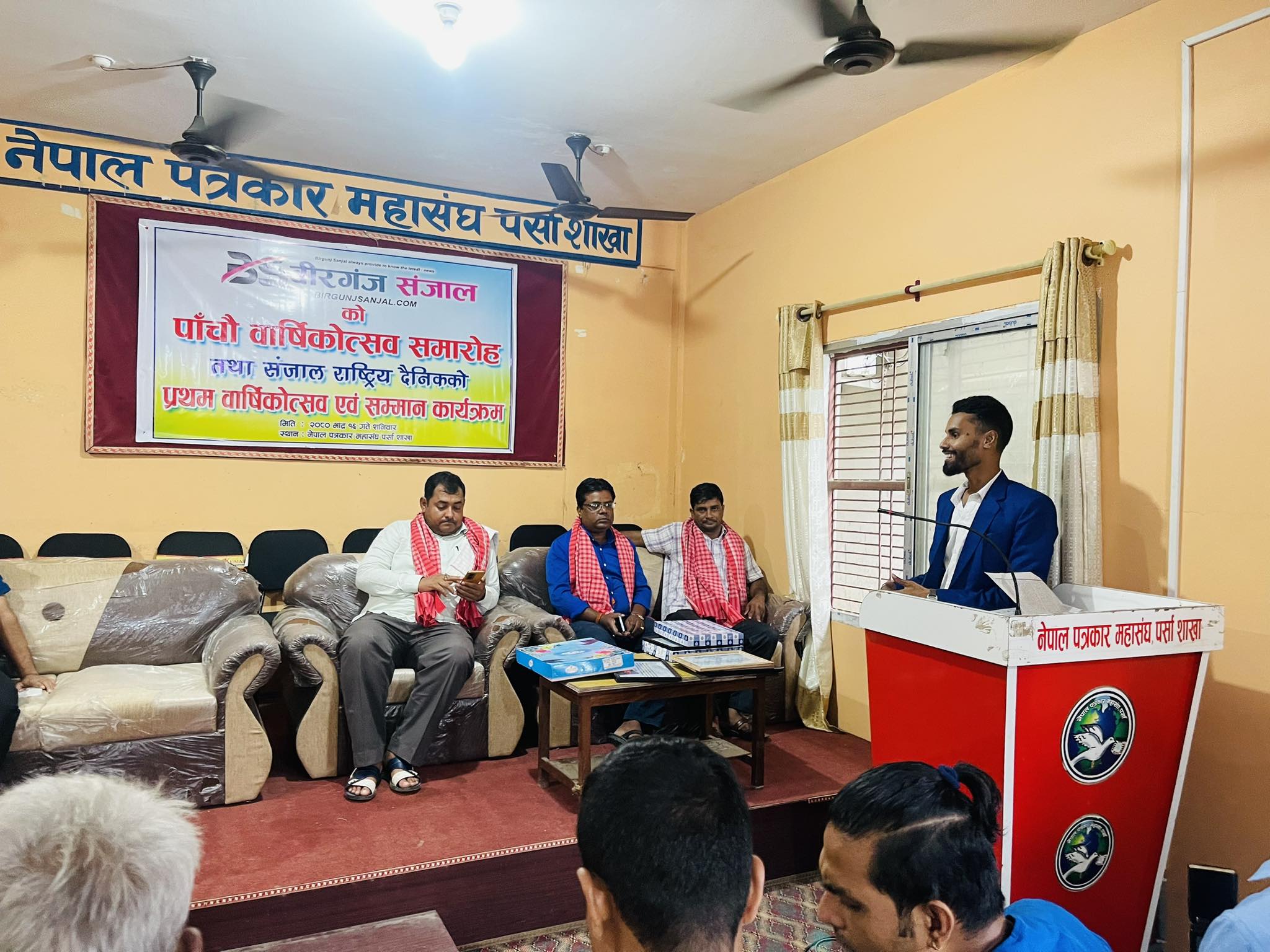 वीरगंज । नेपाल पत्रकार महासंघ पर्सा शाखाका अध्यक्ष अनुप तिवारीले अहिलेका युवा पत्रकार तस्करी र भन्सारका समाचारमा मात्र केन्द्रित रहेको भन्दै त्यसलाई सच्चिन आग्रह गर्नुभयो । युवाहरुको संजालद्वारा संचालित वीरगंज संजाल डट कमको पाँच वर्ष, वीरगंज संजाल वीरगंज संजाल पत्रिकाको दोश्रो तथा संजाल राष्ट्रिय दैनिकको पहिलो वार्षिकोत्सव तथा सम्मान कार्यक्रमलाई प्रमुख अथितिको रुपमा सम्बोधन गर्दै यस्तो भन्नुभयो ।