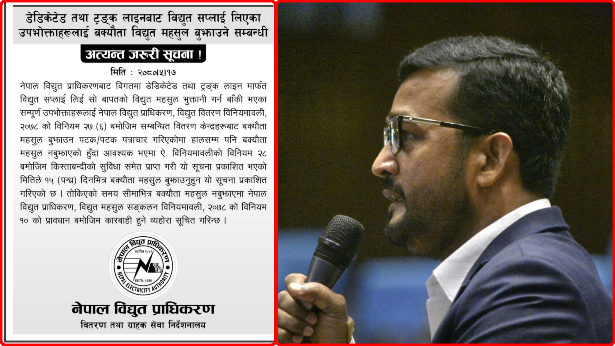 विगतमा डेडिकेटेड तथा ट्रङ्क लाइनमार्फत विद्युत् सप्लाई लिई सो बापतको विद्युत् महसुल भुक्तानी गर्न बाँकी भएका सम्पूर्ण उपभोक्ताहरूलाई नेपाल विद्युत् प्राधिकरण, विद्युत् वितरण विनियमावली, २०७८ को विनियम २७ (६) बमोजिम सम्बन्धित वितरण केन्द्रहरूबाट बक्यौता महसुल बुझाउन पटक/पटक पत्राचार गरिएकोमा हालसम्म पनि बक्यौता महसुल नबुझाएको प्राधिकरणले सूचनामा उल्लेख गरेको छ ।