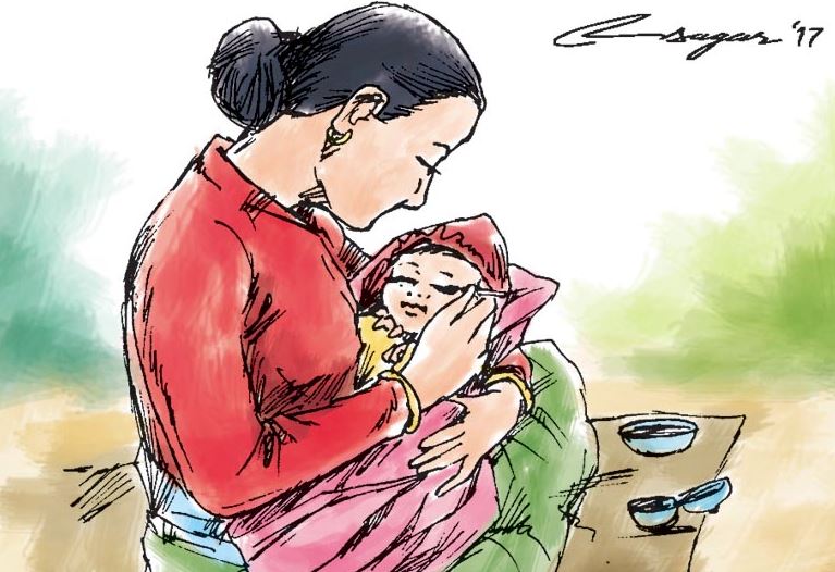 अस्पतालबाट घर झन्डै आधा घण्टाको मात्र बाटो हो । तर सुत्केरीका लागि त्यो पनि हिमाल चढे जस्तै भयो । मीना अलि पर नपुग्दै थर्थरी काँपेर उभिन नसकेर थचक्क बाटामै लडिन् । नलगाड नगरपालिका–७, दल्ली भेरी पारिको किनारको बस्ती हो । वरिपरि लहरै भत्केका घर, छेउमा कतै त्रिपाल, कतै झिँजामिजाले टालेका टहरा धमाधम बनाइँदै थिए । भूकम्पको पीडाले थलिएकाले होला । सुत्केरीलाई सघाउन कोही आएनन् ।