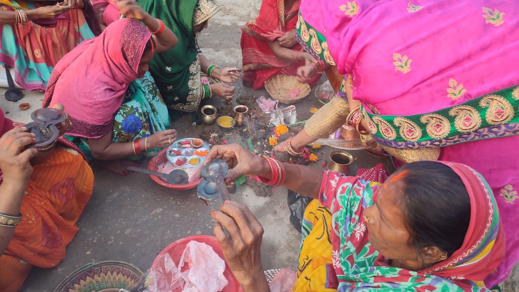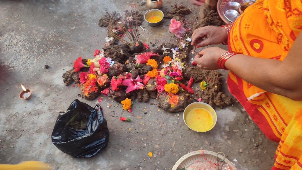 पर्वमा गाईको गोबरले लिपेर पवित्र बनाइएको चतुष्कोण वेदीभित्र गोबरकै मानव आकृति बनाएर धान, सिन्दूर, फूल, दुबो र पिठार (पानीमा घोलिएको अरवा चामलको पिठो) ले पूजा गर्ने गरिन्छ।
