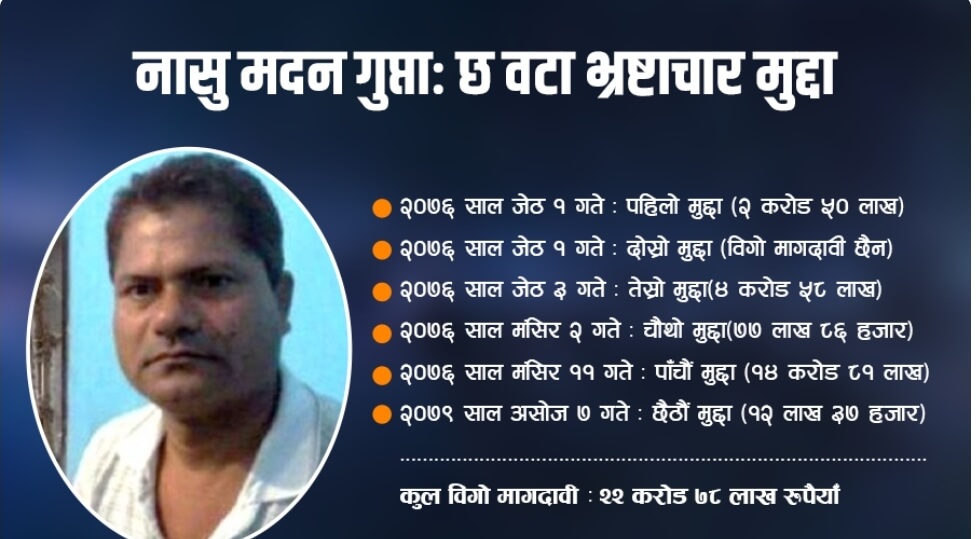 दोषी ठहर भएका आरोपितमध्ये एक नासु मदन प्रसाद गुप्तामाथि ६ वटा भ्रष्टाचार मुद्दा लागेको थियो । नौ वर्षअघि राजस्व हिनामिनाको घटनामा अख्तियारले उनीमाथि ९५ लाख ८ हजार रुपैयाँ विगो मागदावी गरेको थियो ।