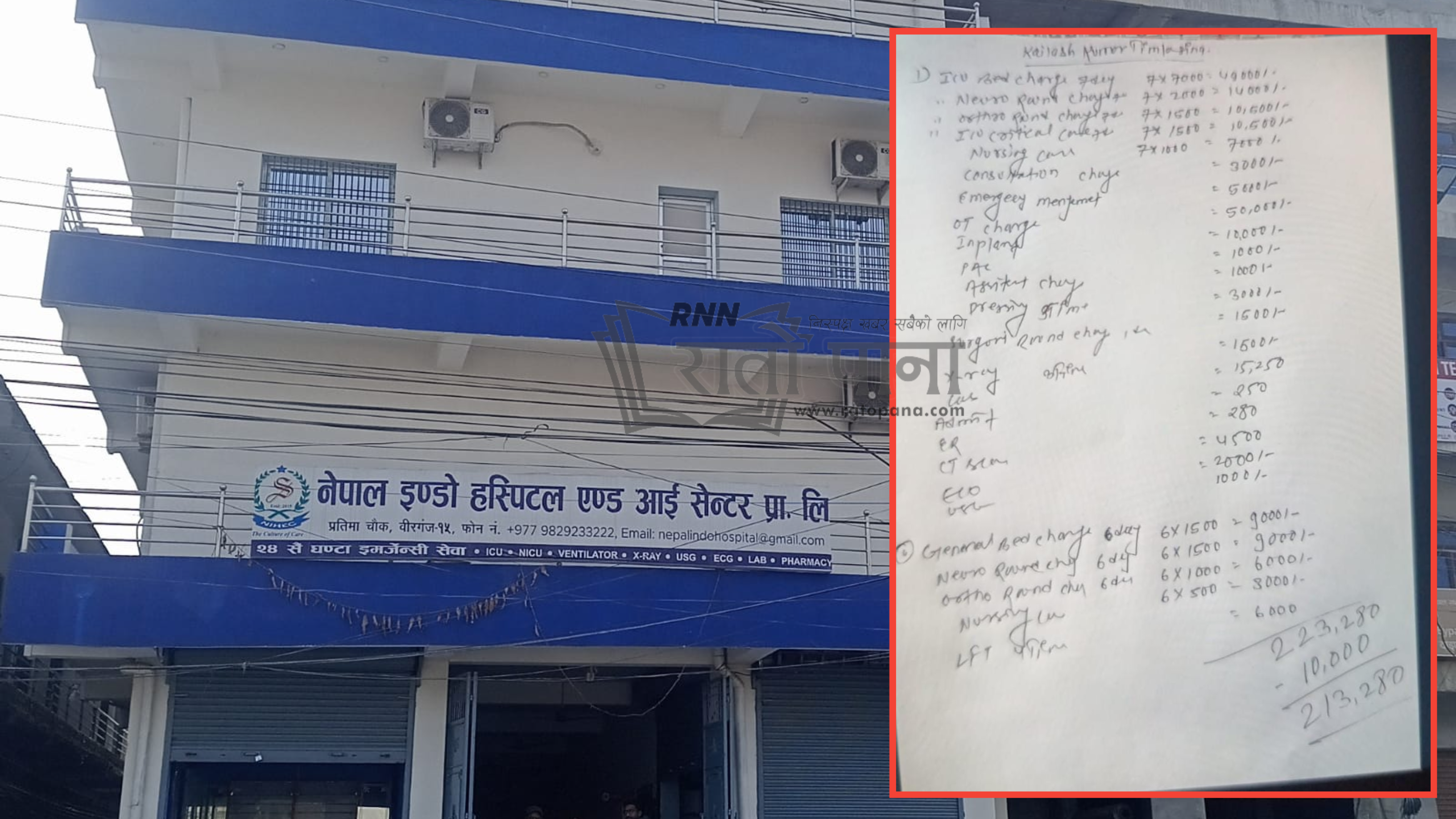वीरगन्जको प्रतिमाचाैकमा रहेकाे नेपाल इण्डाे हस्पिटलले दुई जना बिरामीलाई सादा बिल दिएर करिब ३ लाख ५० हजार रूपैया ठगेकाे एक बिरामीका आफन्तले बताए ।