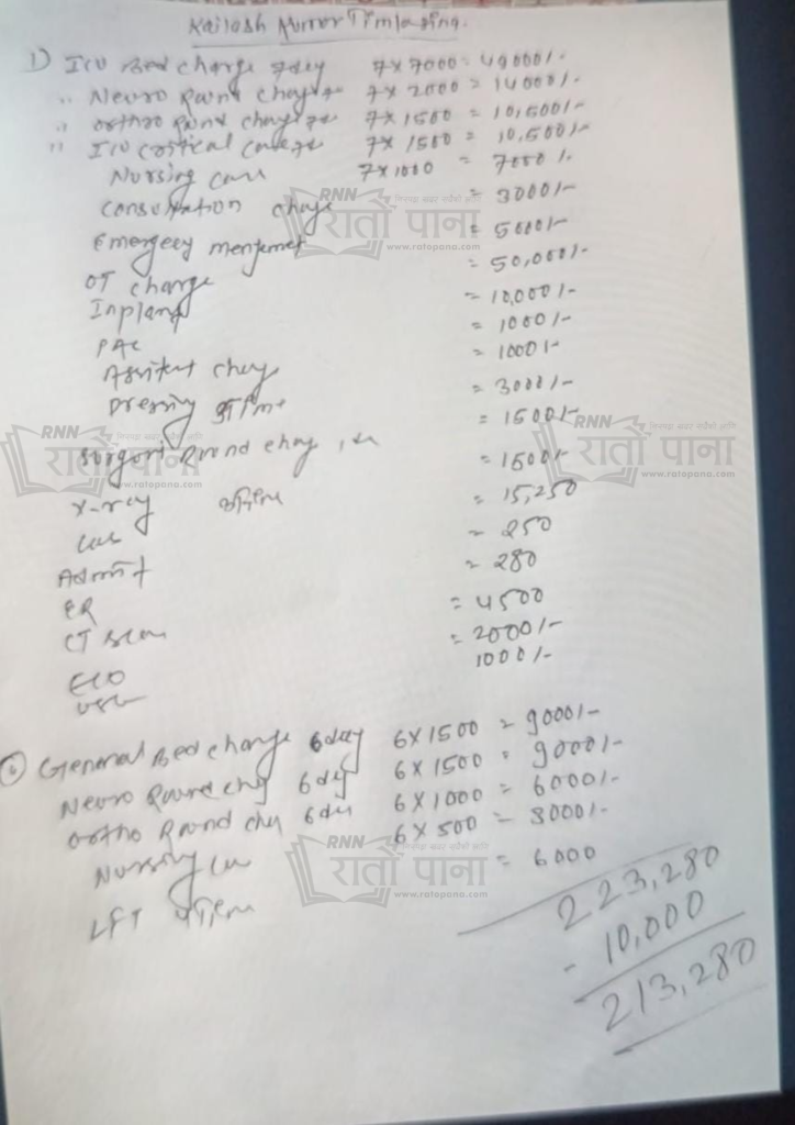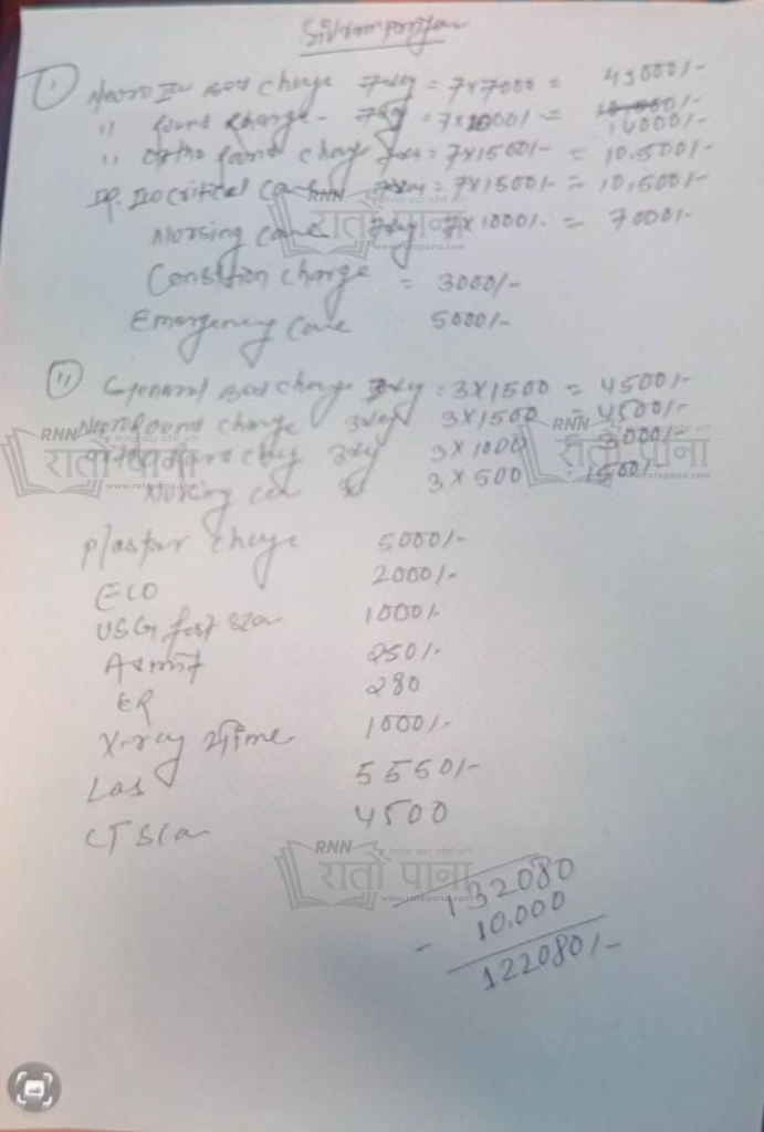 त्यसै गरि विभिन्न चार्जहरू देखाउदै हस्पिटलले दुबै बिरामीहरूकाे लागि रकम असुल गरेको उपचार गराइ रहेका मैजिक चालक समीर देवानले राताेपानलाई बताए । देवानले अस्पताल संग इन्स्योरेन्समा दुर्घटना बिमा दावी गर्नु पर्ने भएकाे हुदा बिल माग्दा अस्पतालका डाक्टर प्रमान्नद साहले देवानलाई सादा कागजमा हातले लेखेर बिल दिएका थिए । अस्पतालकाे बिल दिन नमाने पछि देवानले संचारकर्मीलाई बाेलए पछि याे कुरा बाहिर आएको हाे ।