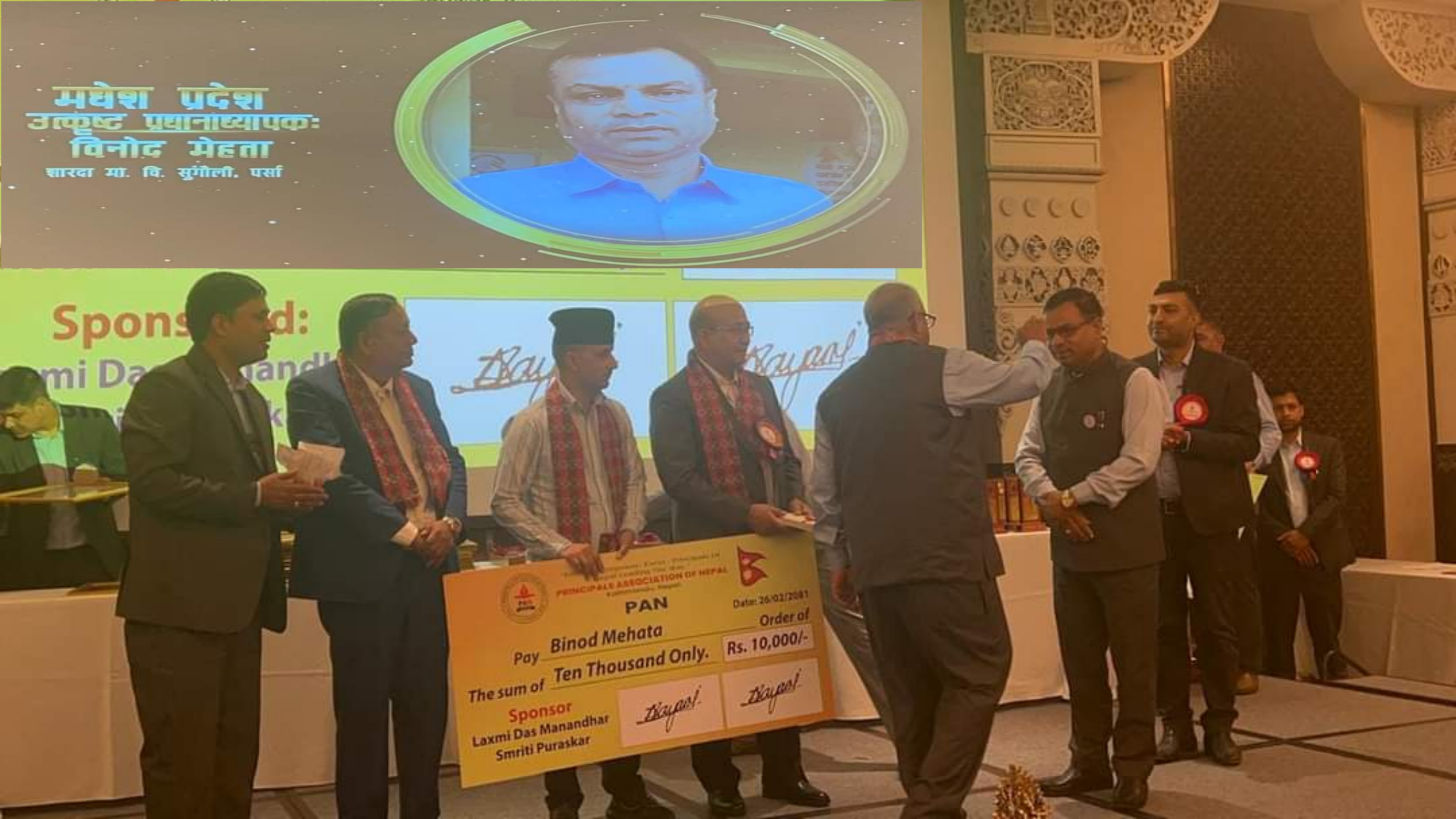 वीरगंज । मधेश प्रदेशकै उत्कृष्ट प्रधानाध्यापकको रूपमा श्री शारदा मावि बहुअरी सुगौली वीरगंज-२४ का प्रधानाध्यापक विनोद मेहता सम्मानित भएका छन् ।