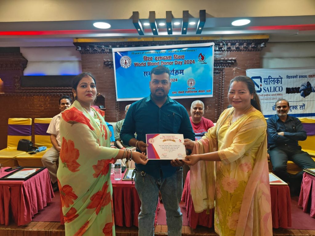 वीरगन्ज । ब्लड डाेनर्स एसाेसिएशन नेपाल पर्साले विश्व रक्तदाता दिवसकाे अवसरमा शुक्रबार सम्मान कार्यक्रम सम्पन्न गरेको छ ।