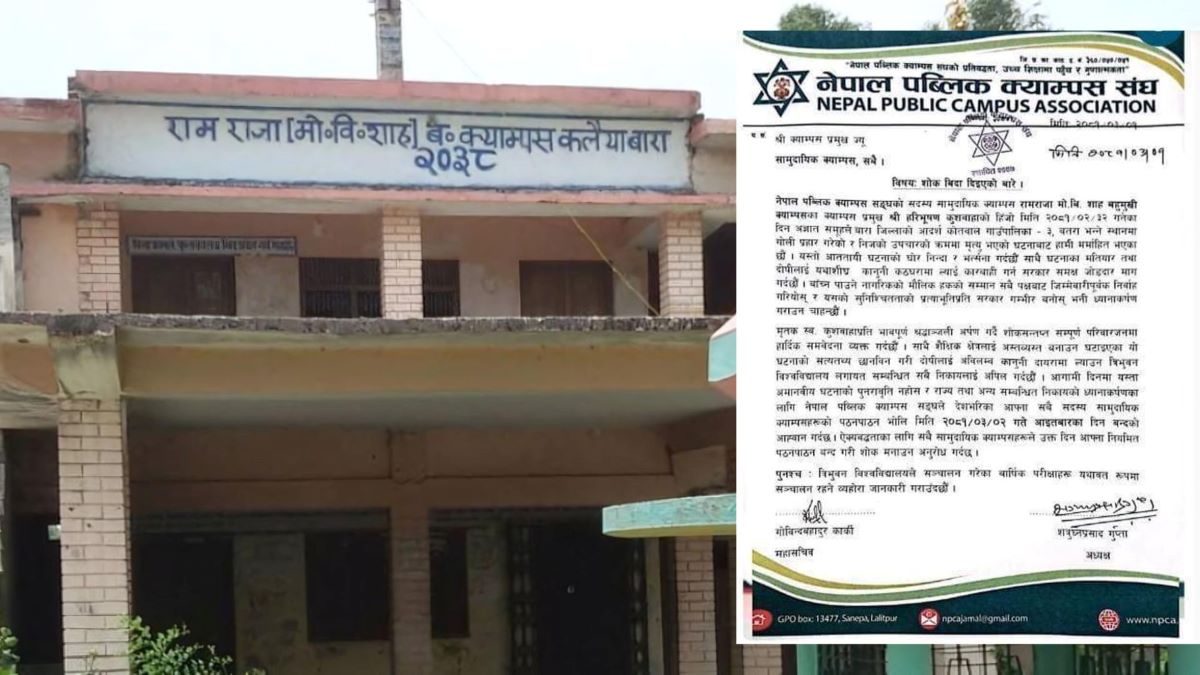 संघले बाराको कलैयास्थित रामराजा मोहनविक्रम साह बहुमुखी क्याम्पसका प्रमुख हरिभूषण कुशवाहाको गोली हानी हत्या गरेको घटनाको छानबिनमा दबाब दिन आज सामुदायिक क्याम्पस बन्द गर्ने निर्णय गरेको हो ।