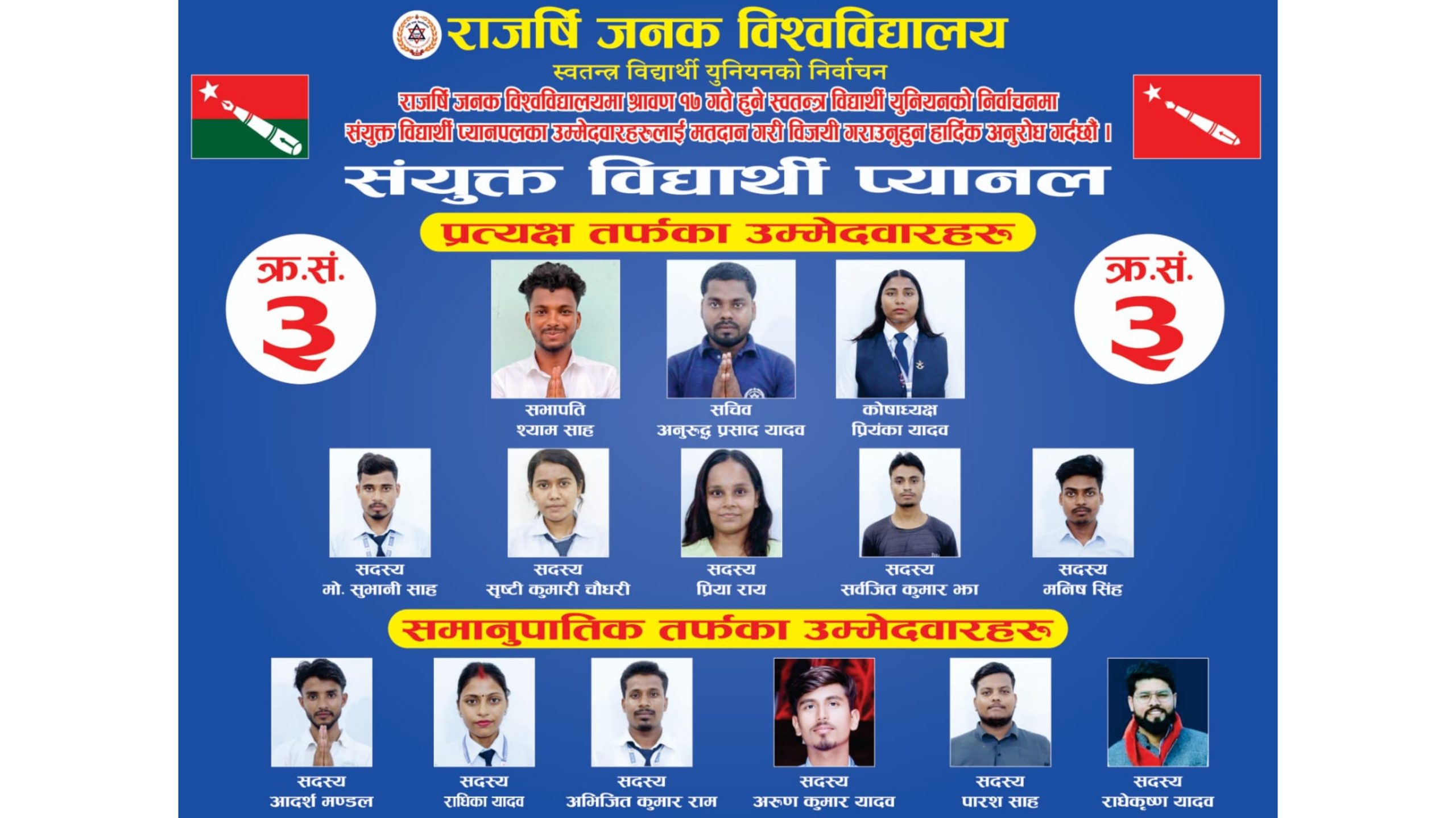 धनुषा । राजर्षी जनक विश्वविद्यालयमा हुने स्वतन्त्र विद्यार्थी युनियनको चुनावमा संयुक्त विद्यार्थी प्यानलले विश्वविद्यालय शिक्षालाई निःशुल्क बनाउने प्रतिवद्धताका साथ चुनावी मैदानमा उत्रिएको छ। अखिल क्रान्तिकारी, अनेरास्ववियु, र समाजवादी विद्यार्थी युनियनले साउन १७ गते हुने स्ववियु निर्वाचनमा यो प्रतिवद्धताका साथ संयुक्त उम्मेद्वारी दिएका छन्।
