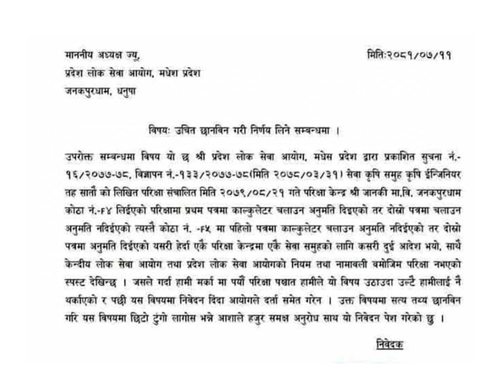 जनकपुरधाम । मधेश प्रदेश लोकसेवा आयोगको परीक्षा निष्पक्ष नभएको परीक्षार्थीले गुनासो गरेका छन् । २०७८ सालमा भएको कृषि इन्जिनियर सेवा समूहको सातौं तहको लिखित परीक्षामा परीक्षार्थीबीच विभेद भएको खुलेको छ ।