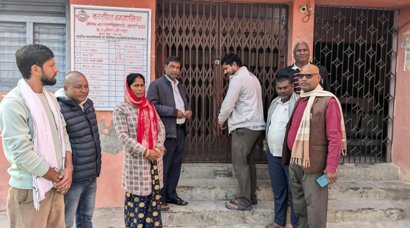 बिरगंज l रौतहटको कटहरिया नगरपालिकामा कार्यालयमा तालाबन्दी भएको छ । उपमेयर रिता देवी यादवको नेतृत्वमा मङ्गलवार कर्मचारीहरूलाई कार्यालयबाट बाहिर निकालेर तालाबन्दी गरिएको हो । घर–घरमा रजिस्टर घुमाएर हस्ताक्षर गराई गरिएको निर्णय बदर गर्नुपर्ने माग गर्दै तालाबन्दी गरिएको छ ।
