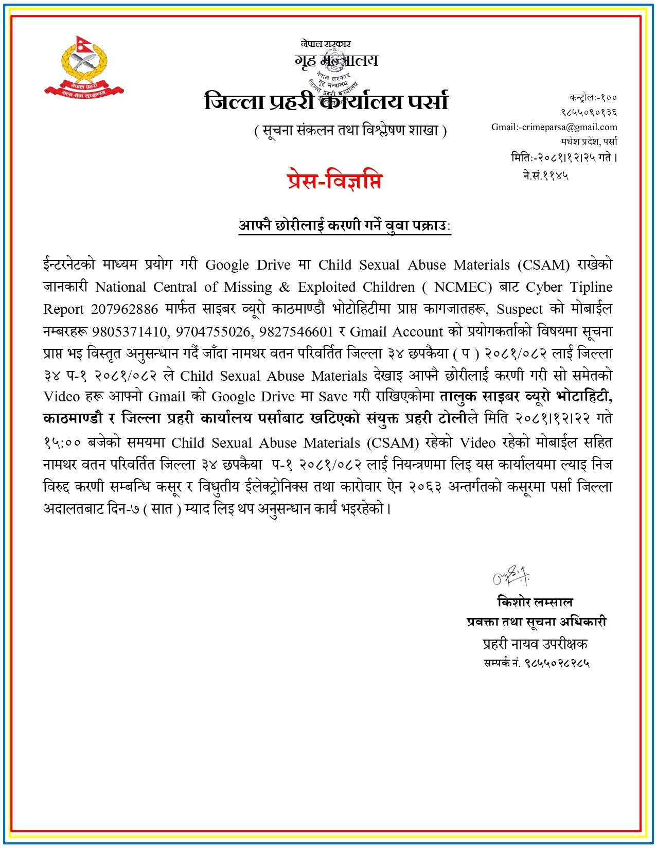 डिएसपी लम्सालका अनुसार साइबर ब्युरो भोटाहिटी काठमाडौँ र जिल्ला प्रहरी कार्यालय पर्साको संयुक्त टोलीले मिति चैत २२ गते दिउँसो ३ बजेको समयमा जिल्ला ३४ छपकैया (प) २०८१/०८२ लाई बाल यौन शोषण सामग्रीसहितको भिडियो भएको मोबाइलसहित नियन्त्रणमा लिएको थियो ।