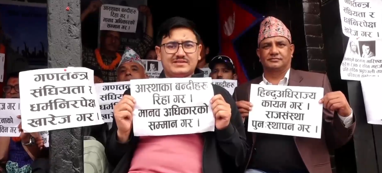 उनीहरूले झुठा मुद्दा खारेज गर, राष्ट्रवादीलाई रिहा गर, विधिको शुशासन कायम गर, नागरिक स्वतन्त्रता हक कायम गरलगायत लेखिएका प्लेकार्ड प्रदर्शन गरेका थिए।