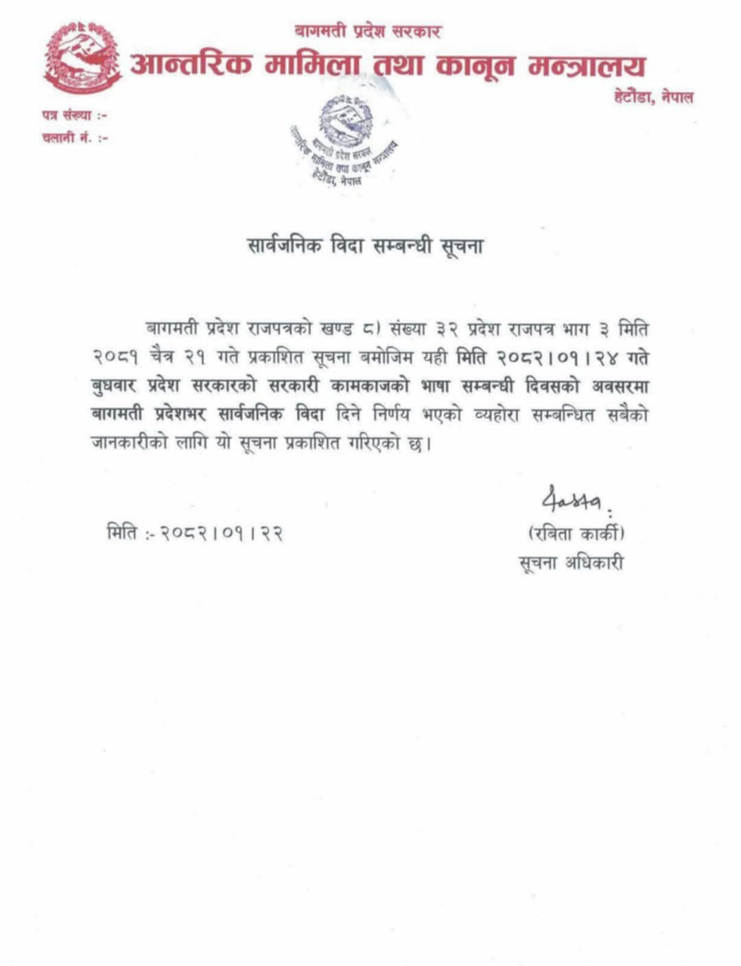 बागमती प्रदेशको आन्तरिक मामिला तथा कानुन मन्त्रालयका अनुसार गत चैत २१ गतेको निर्णय अनुसार आज सो सार्बजनिक बिदा दिइएको सो मन्त्रालयकी सुचना अधिकारी रबिता अधिकारीले जानकारी दिइन् ।