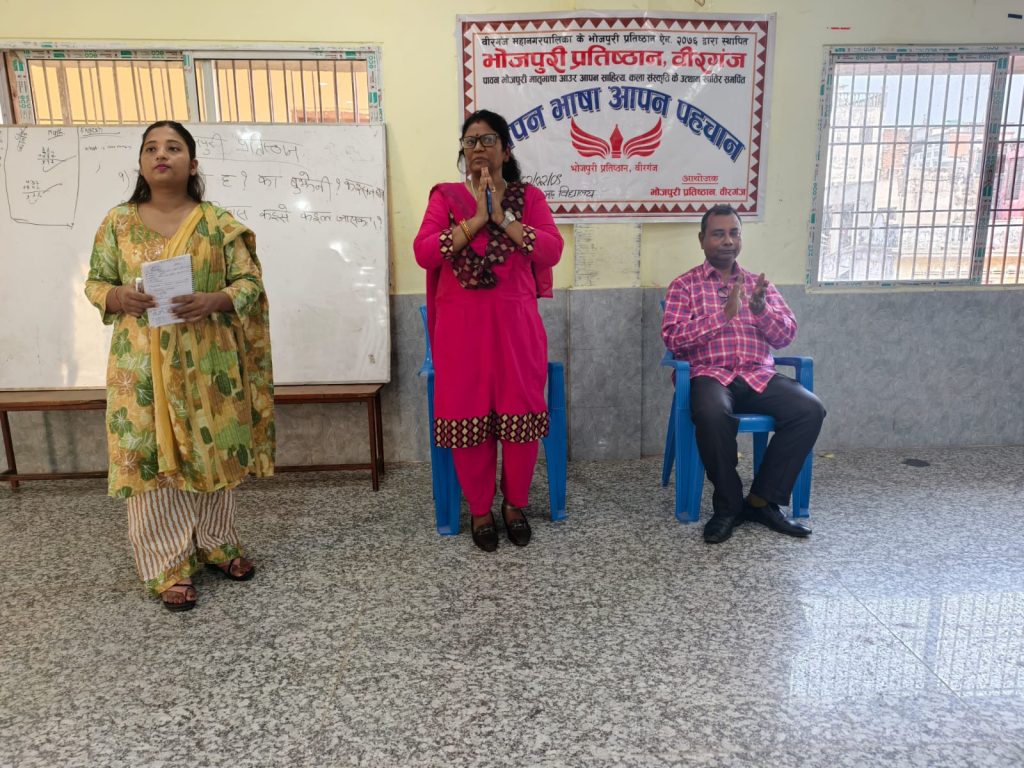 त्यस्तै वीरगंज महानगरपालिकाका प्रमुख प्रशासकिय अधिकृत अरविन्द लाल कर्णले वीरगंज महानगरपालिका अन्तर्गत रहेको भोजपुरी प्रतीष्ठानले विगत केही महिनादेखी भाषा, कला संस्कृतीको जगेर्नाका लागि विधार्थीहरुलाई लक्षित गरी संचालन गर्दै आएको कार्य प्रशंसनिय रहेको बताउँदै सबैले आफ्नो मातृभाषामा बोल्न , लेख्न , आफ्ना विचार अभिव्यक्त गर्न पाउनुपर्ने धारणा राखे ।