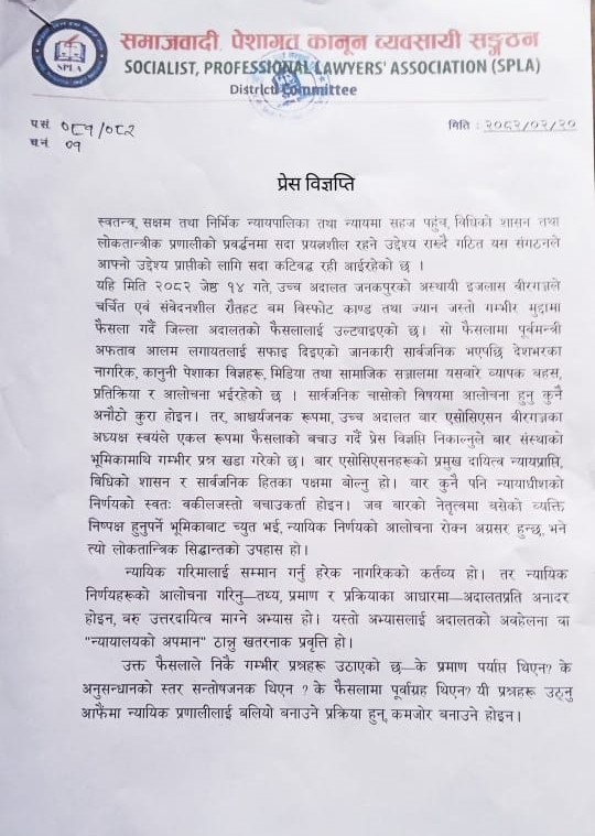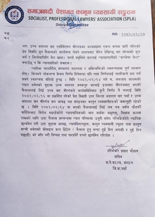 संगठनका पर्सा सचिव हरिशंकर प्रसाद चौहानद्वारा हस्ताक्षरित विज्ञप्तिमा भनिएको छ, “२०७८ साल जेठ १४ गतेको फैसलाको दुई दिन अघि र दुई दिन पछाडिसम्मको सम्पर्क विवरण जाँच गरेर न्यायपालिकामा भएको सम्भावित हस्तक्षेपबारे निष्पक्ष छानबिन गर्नुपर्छ।”