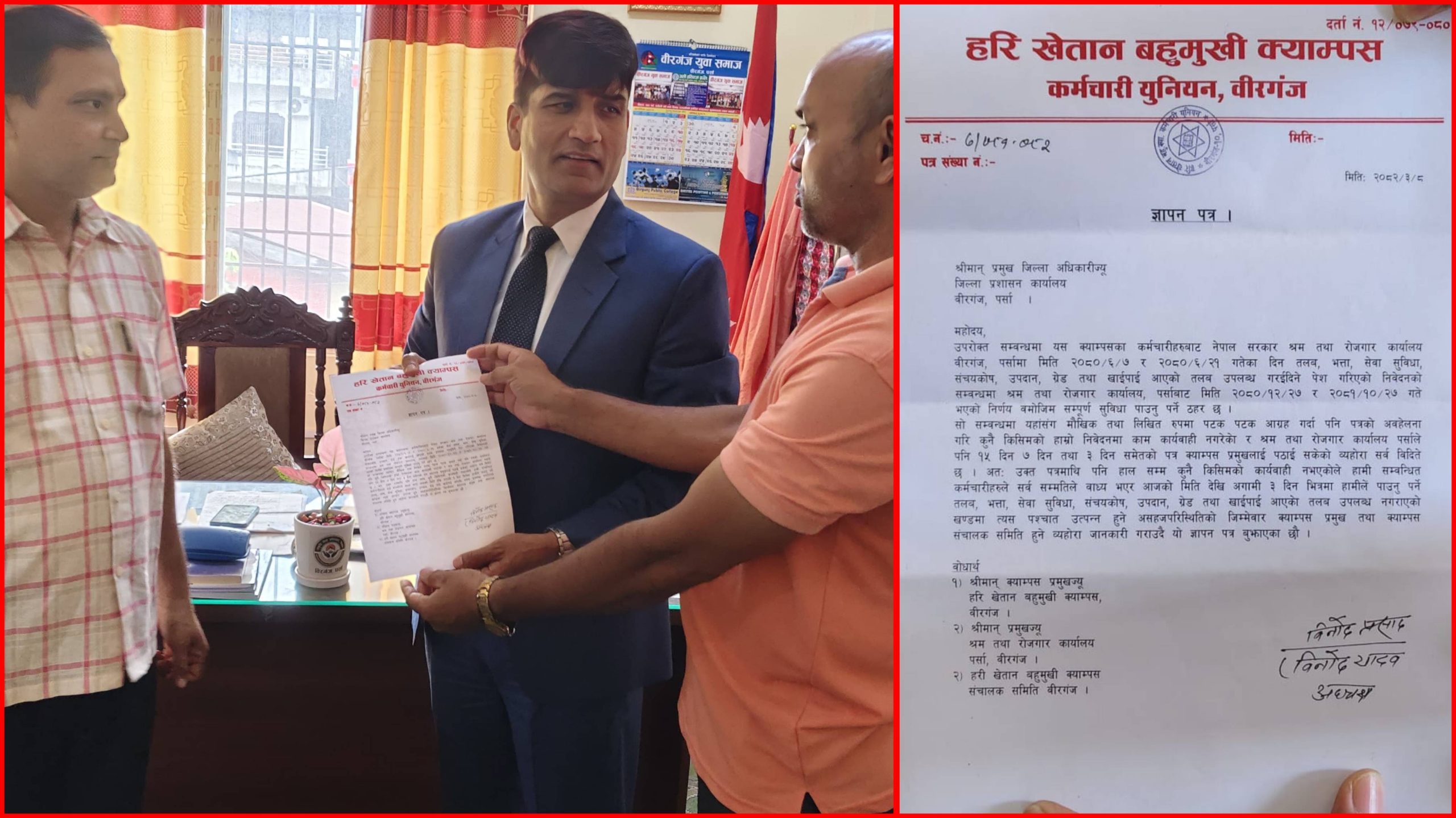 ज्ञापनपत्रमा श्रम तथा रोजगार कार्यालय, वीरगञ्जमा २०८० असोज ७ र २१ गते पेश गरिएको निवेदन र त्यसका आधारमा २०८० चैत २७ र २०८१ माघ २७ गते गरिएको निर्णयअनुसार सम्पूर्ण सेवा सुविधा उपलब्ध गराउनुपर्ने निर्णय भएको उल्लेख छ। तर क्याम्पस प्रशासनले अहिलेसम्म उक्त निर्णय कार्यान्वयन नगरेको उनीहरूको गुनासो छ।