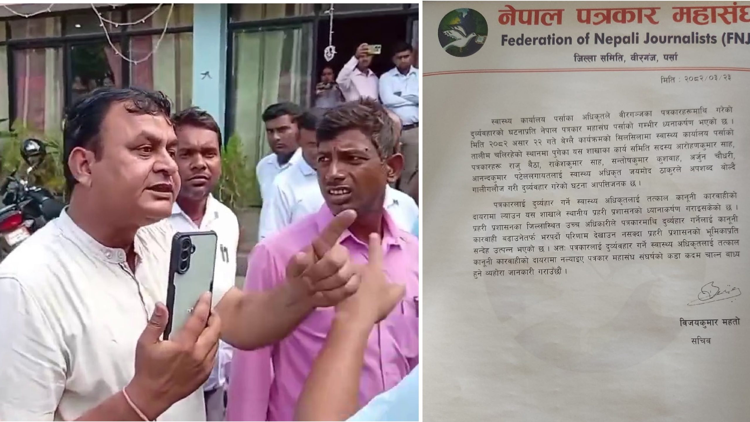 महासंघका अनुसार असार २२ गते एक कार्यक्रमको सिलसिलामा स्वास्थ्य कार्यालय पर्साले सञ्चालन गरिरहेको तालिमस्थलमा पुगेका महासंघका कार्यसमिति सदस्य आरोहणकुमार साहसहित पत्रकारहरू राजु बैठा, राकेशकुमार साह, सन्तोषकुमार कुशवाह, अर्जुन चौधरी, आनन्दकुमार पटेल लगायतलाई स्वास्थ्य अधिकृत जयमोद ठाकुरले अपशब्द प्रयोग गर्दै गालीगलौज र दुर्व्यवहार गरेका थिए।