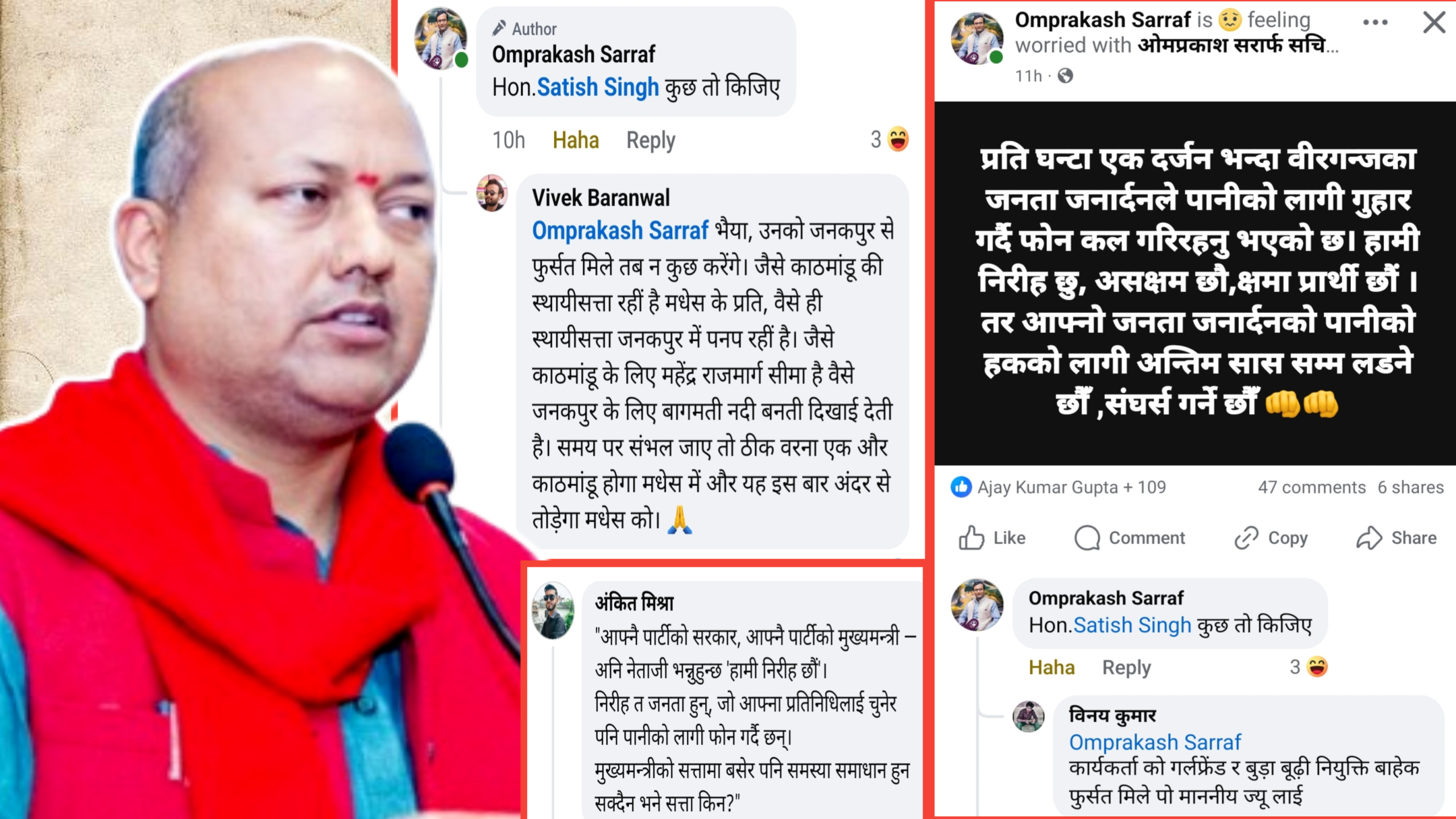 सर्राफले सामाजिक सञ्जालमा लेखेका छन्, “प्रति घण्टा एक दर्जनभन्दा बढी वीरगन्जका जनताले पानीको लागि गुहार गर्दै फोन कल गरिरहनु भएको छ। हामी निरीह छौं, असक्षम छौं, क्षमा प्रार्थी छौं। तर जनताको पानीको हकको लागि अन्तिम साससम्म लड्नेछौं, संघर्ष गर्नेछौं।” उनले मुख्यमन्त्रीलाई ट्याग गर्दै लेखेका छन् — “Hon. Satish Singh, केही त गर्नुहोस्।”