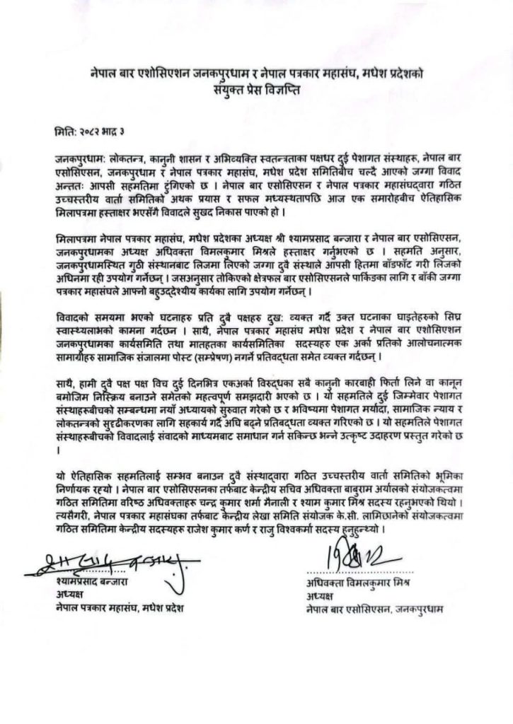 वीरगन्ज । जनकपुरधाममा चल्दै आएको नेपाल बार एसोसिएसन र नेपाल पत्रकार महासंघबीचको जग्गा विवाद अन्ततः आपसी सहमतिमा समाधान भएको छ।
