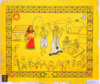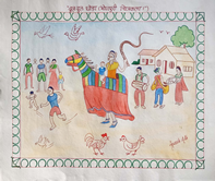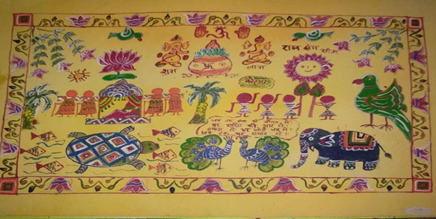 बिवाहमा दुलही पक्षका घरमा सजावटका रुपमा मयुर, फुलहरु, हाती, स्वस्तिक, दुलहीका डोलीका प्रतिकात्मक चित्रहरु बनाउने गरिन्छ । विवाहमा दुलही पक्षका घरमा पुजा गर्न बस्नका लागि विभिन्न रंगमा रंगिएका चामल प्रयोग गरी “चौका” चित्र बनाउने गरिन्छ । त्यसतै विवाहमा प्रयोग गरिने गाग्रीमा हल्दी र चंदनले धार्मिक र सांस्कृतिक चित्रहरु बनाउने गरिन्छ ।