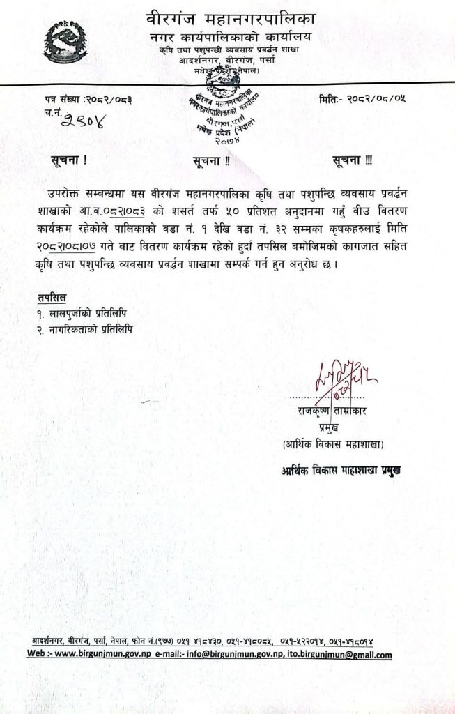 बीउ वितरण कार्यक्रम मंसिर ७ गते (२०८२/०८/०७) बाट सुरु हुने जानकारी शाखाले दिएको छ। यसका लागि किसानहरूले आवश्यक कागजातसहित कृषि तथा पशुपन्छी व्यवसाय प्रवर्द्धन शाखामा सम्पर्क गर्नुपर्नेछ।