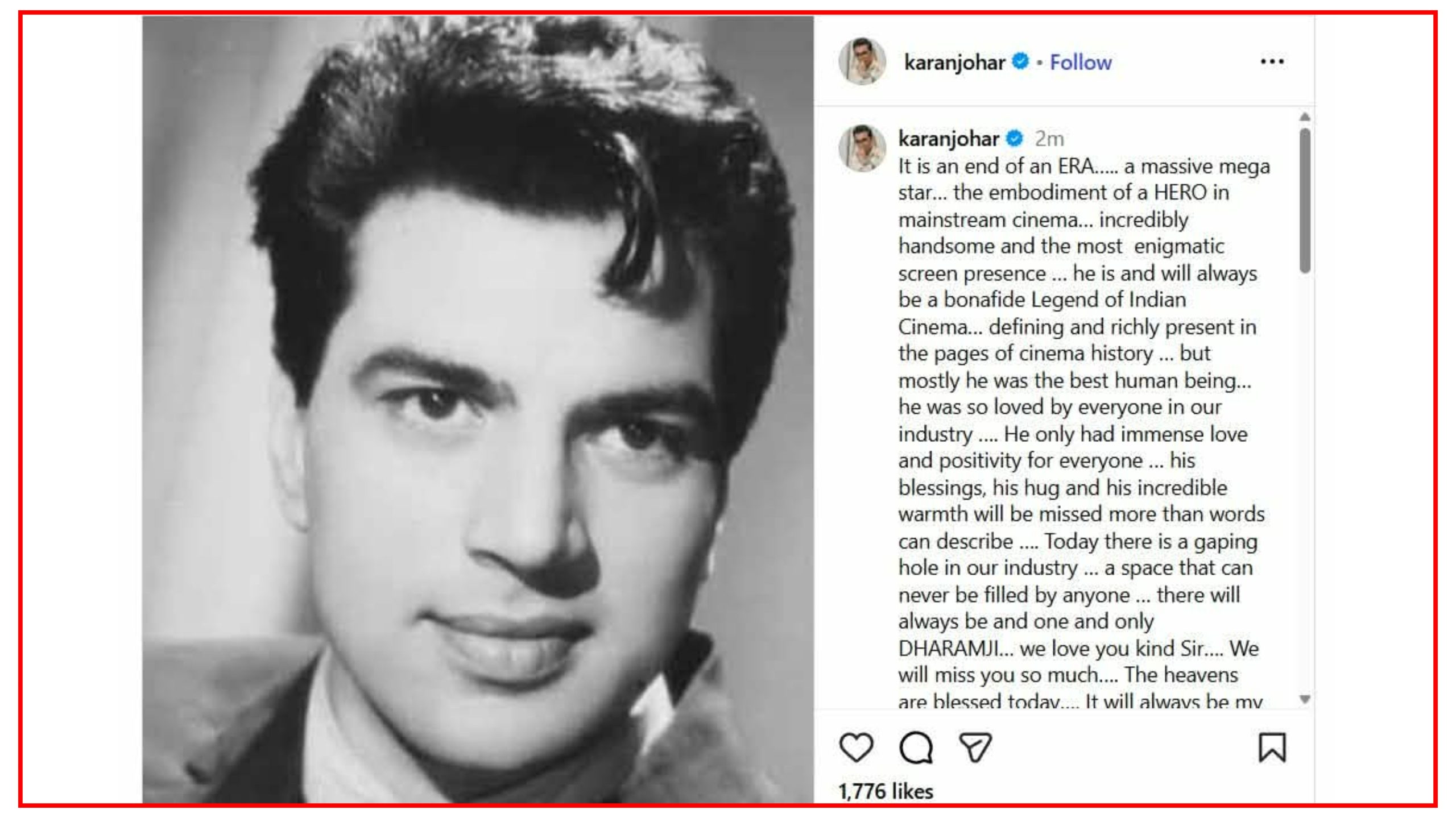बलिउड फिल्म निर्माता करण जौहरले अभिनेता धर्मेन्द्रको निधन भएको पुष्टि गर्दै सामाजिक सञ्जालमार्फत श्रद्धाञ्जली अर्पण गरेका छन् ।