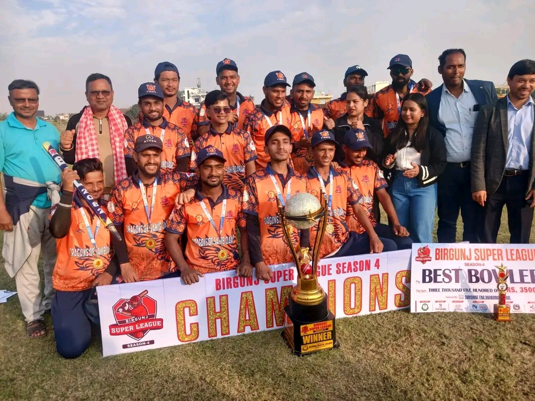 बीरगन्ज । बीरगन्ज युथ स्पोर्टिङ एकेडेमीद्वारा लगातार दोस्रोपटक आयोजना गरिएको प्रतिष्ठित ‘बीरगन्ज सुपर लिग–४’ को फाइनलमा “ड्रेगन अफ साहिब दरबार” ले शानदार प्रदर्शन गर्दै उपाधि हात पारेको छ।