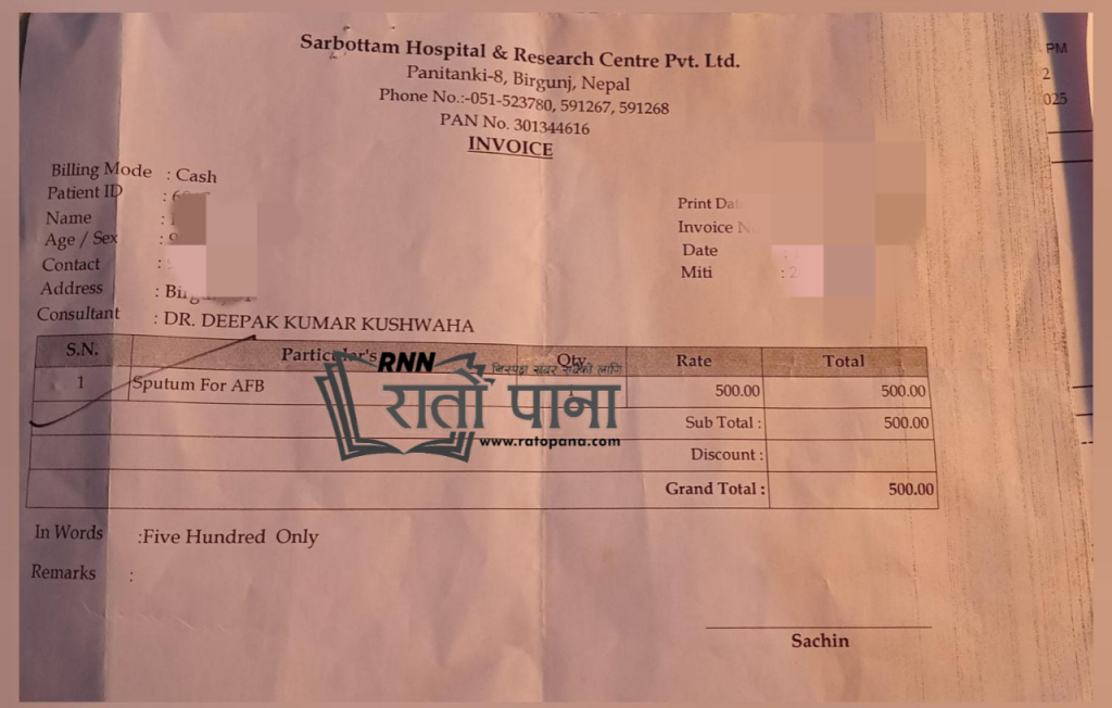 वीरगञ्ज । नेपाल सरकारले क्षयरोग (टीबी) पहिचानका लागि उपलब्ध गराउँदै आएको Sputum for AFB परीक्षण पूर्ण रूपमा निःशुल्क हुँदाहुँदै वीरगञ्जस्थित सर्वोत्तम अस्पतालले बिरामीसँग शुल्क लिएर जाँच गराएको तथ्य सार्वजनिक भएको छ।