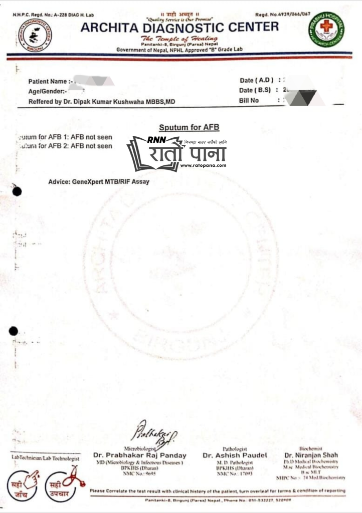 प्राप्त विवरणअनुसार अस्पतालले एक जना बिरामीसँग पाँच सय रुपैयाँ शुल्क असुली Sputum for AFB परीक्षण गराएको हो। तर अस्पतालले आफैं परीक्षण नगरी बिरामीलाई अर्चिता डाइग्नोस्टिक सेन्टरमा पठाउने गरेको र बिल भने अस्पतालको नाममा काट्ने तथा जाँच रिपोर्ट सेन्टरको नामबाट जारी गर्ने गरिएको तथ्य बिल र रिपोर्टबाट प्रमाणित भएको छ।