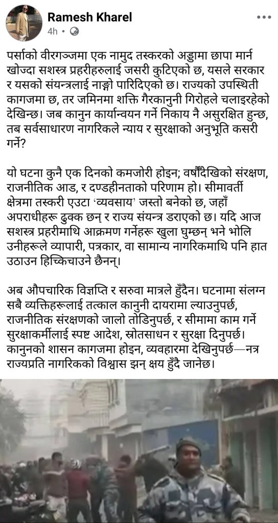 उनका अनुसार यो घटना आकस्मिक कमजोरी नभई वर्षौँदेखिको राजनीतिक संरक्षण, संस्थागत लापरबाही र दण्डहीनताको परिणाम हो। सीमावर्ती क्षेत्रमा तस्करी अब अपराध होइन, ‘व्यवसाय’ जस्तो बनेको र अपराधीहरू ढुक्क भएर खुलेआम हिँड्ने अवस्था सिर्जना भएको खरेलको भनाइ छ।
