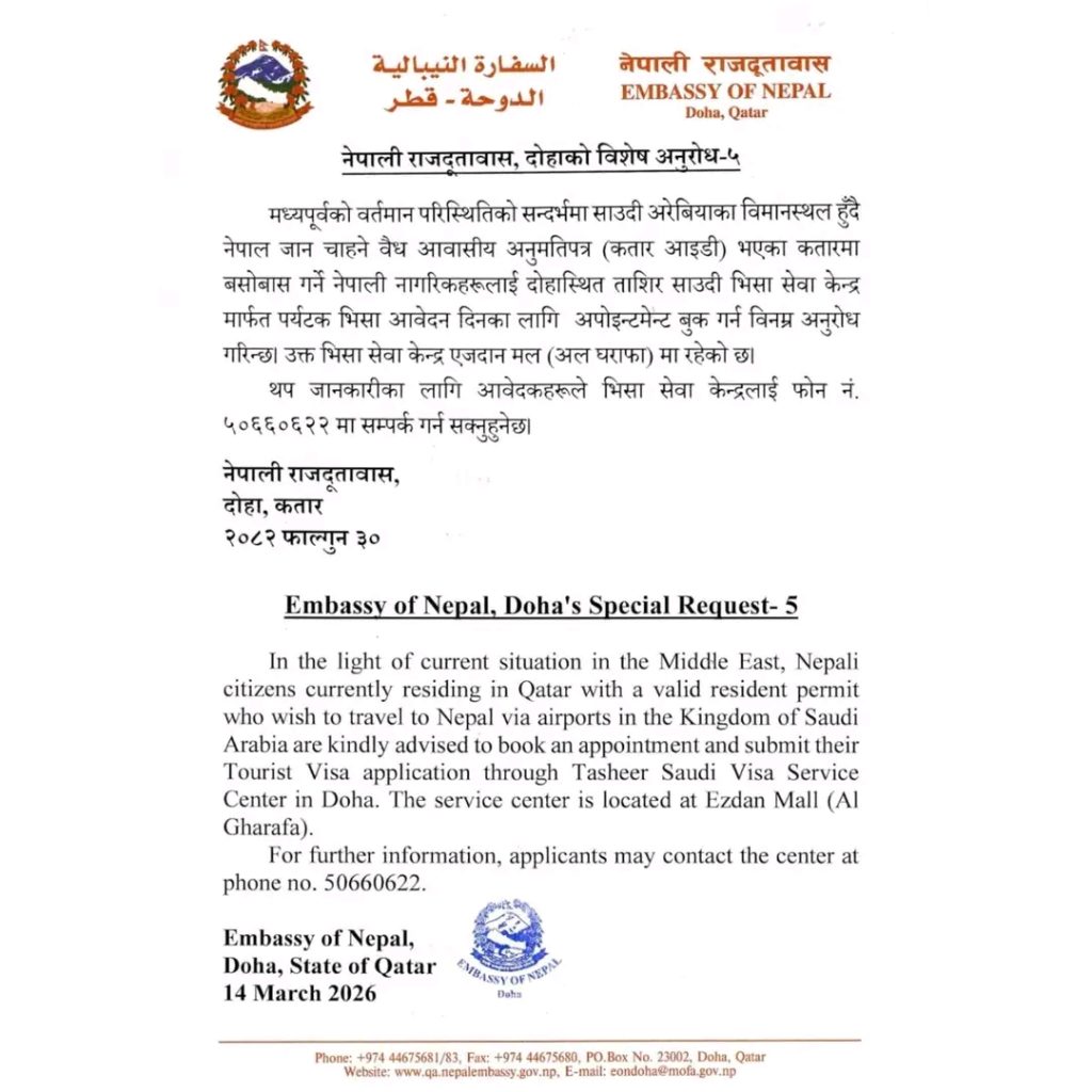 वीरगंज । दोहास्थित नेपाली राजदूतावासले मध्यपूर्वको वर्तमान परिस्थितिलाई ध्यानमा राख्दै कतारमा बसोबास गरिरहेका नेपाली नागरिकलाई साउदी अरेबियाका विमानस्थल हुँदै नेपाल यात्रा गर्दा आवश्यक प्रक्रिया पूरा गर्न विशेष अनुरोध गरेको छ।