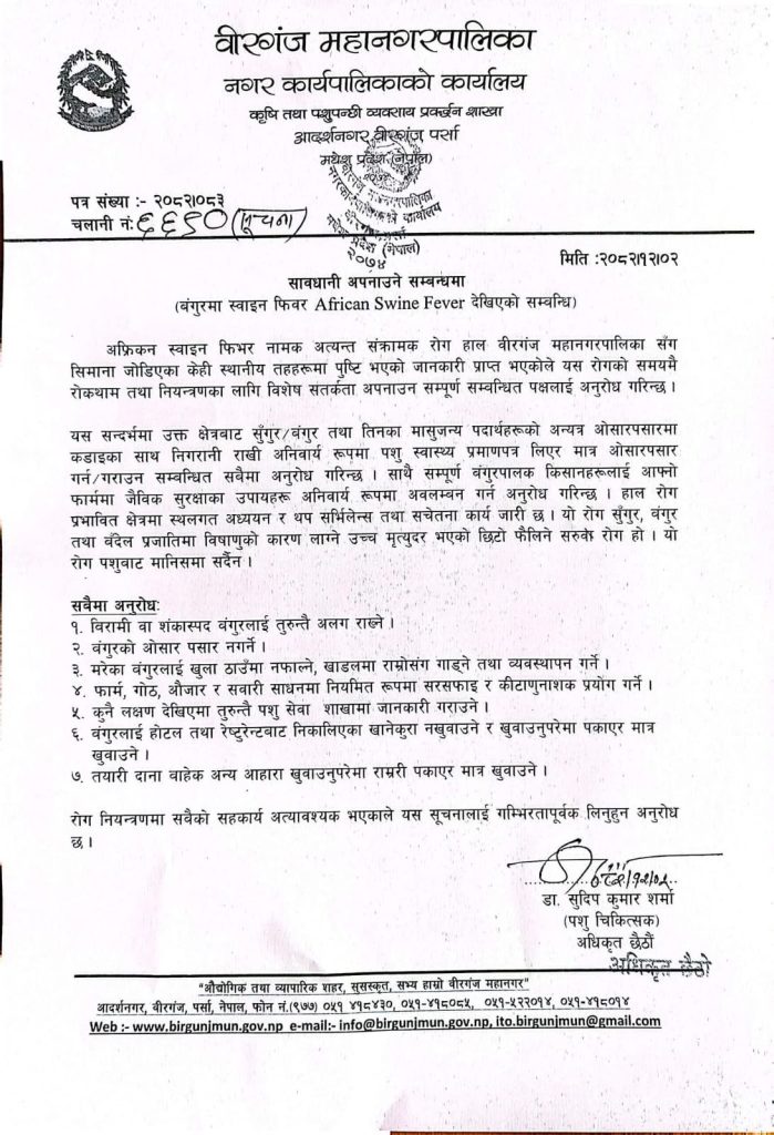 वीरगंज । वीरगंज महानगरपालिकाले अफ्रिकन स्वाइन फिभर (ASF) रोगको पुष्टि भएको सन्दर्भमा सुँगुरपालक किसान र सम्बन्धित पक्षलाई विशेष सतर्कता अपनाउन निर्देशन दिएको छ।