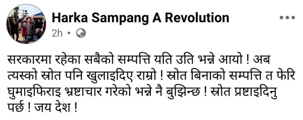 प्रतिनिधिसभा सदस्य हर्क साम्पाङ ले सम्पत्ति सार्वजनिक गर्नु सकारात्मक भए पनि त्यसको स्रोत स्पष्ट नभएसम्म पारदर्शिता अधुरो रहने बताएका छन्। उनका अनुसार स्रोत नखुलेसम्म यस्तो विवरणले पूर्ण विश्वसनीयता पाउन सक्दैन।